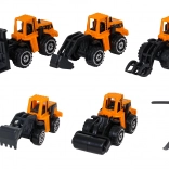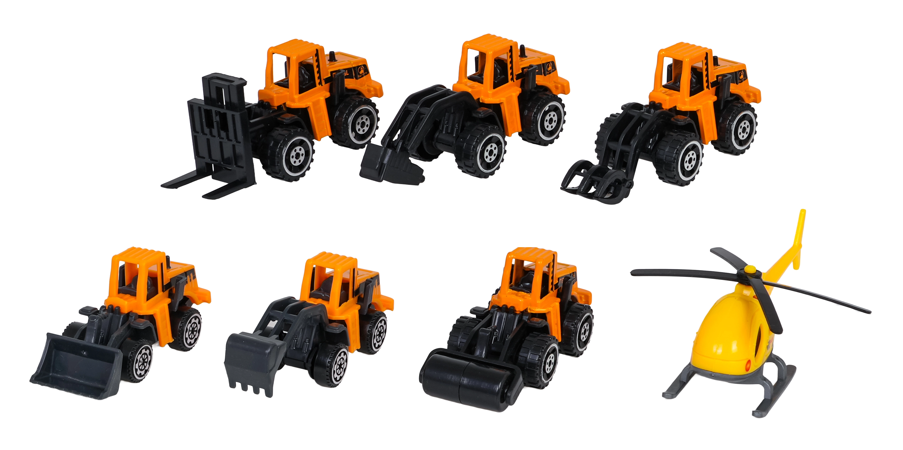 Vysokozdvižný vozík, kladivo, nakladač, valec, voz s radlicou, rýpadlo a žltý vrtuľník. Kovové karosérie a pohyblivé časti pre ešte realistickejšiu hru.