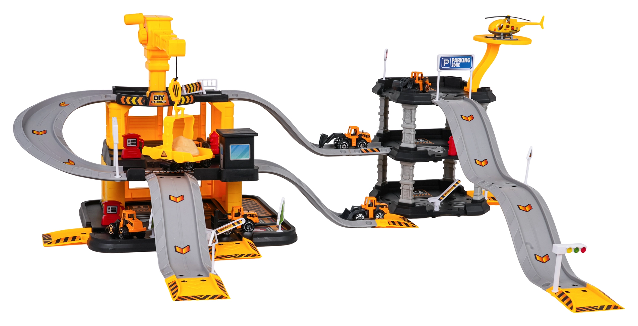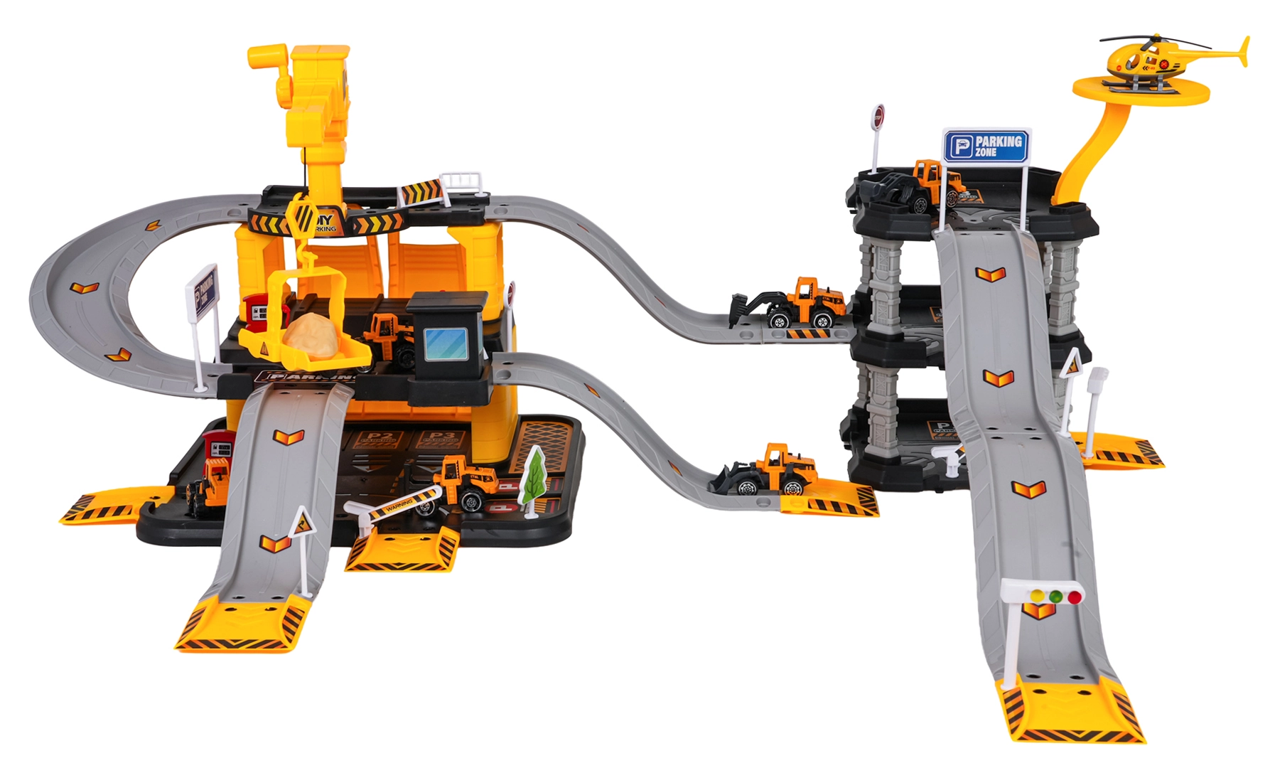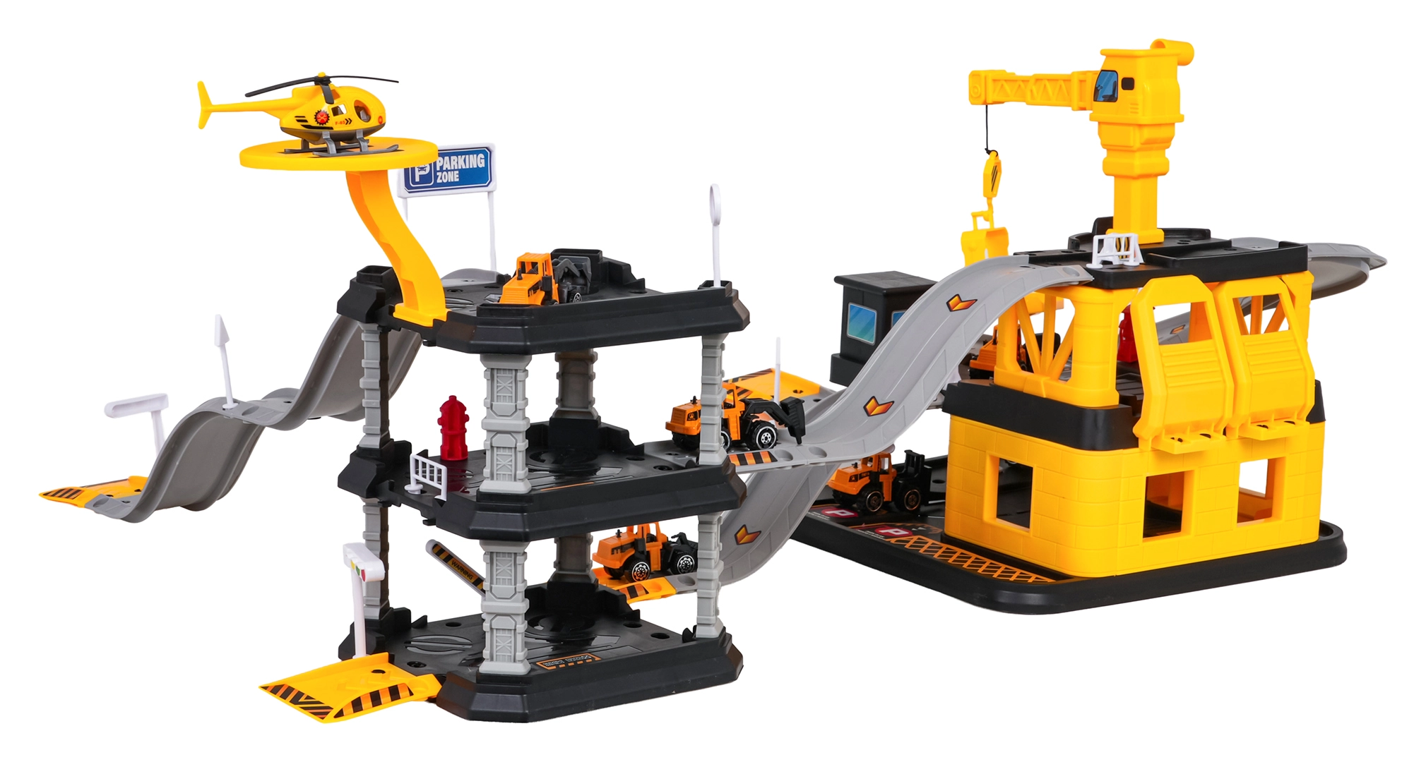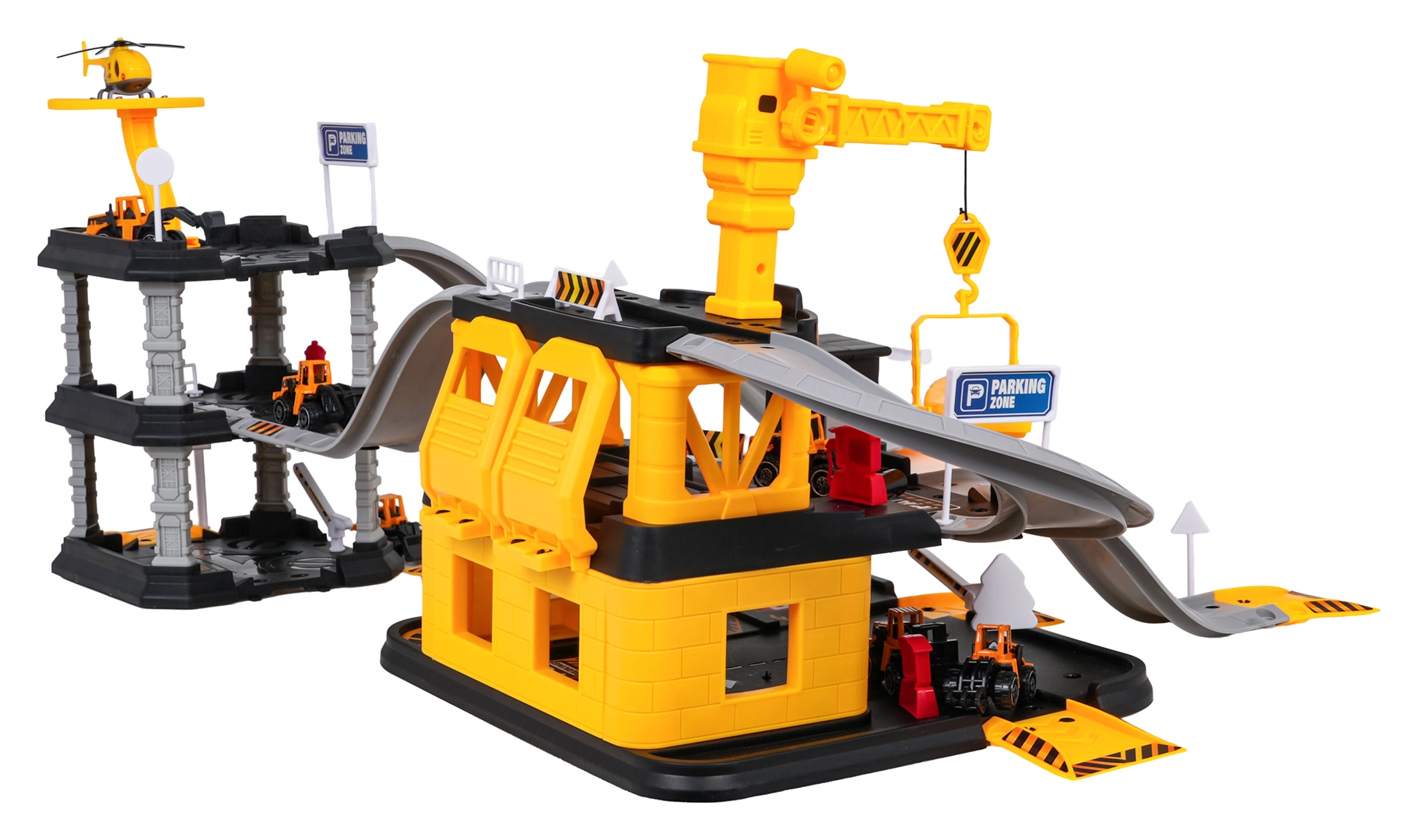 Trojposchodové parkovisko s heliportom je prepojené trojposchodovým staveniskom s rampami a žeriavom. Deti môžu plynule jazdiť medzi zónami a vytvárať vlastné stavebné scenáre.