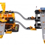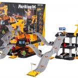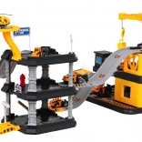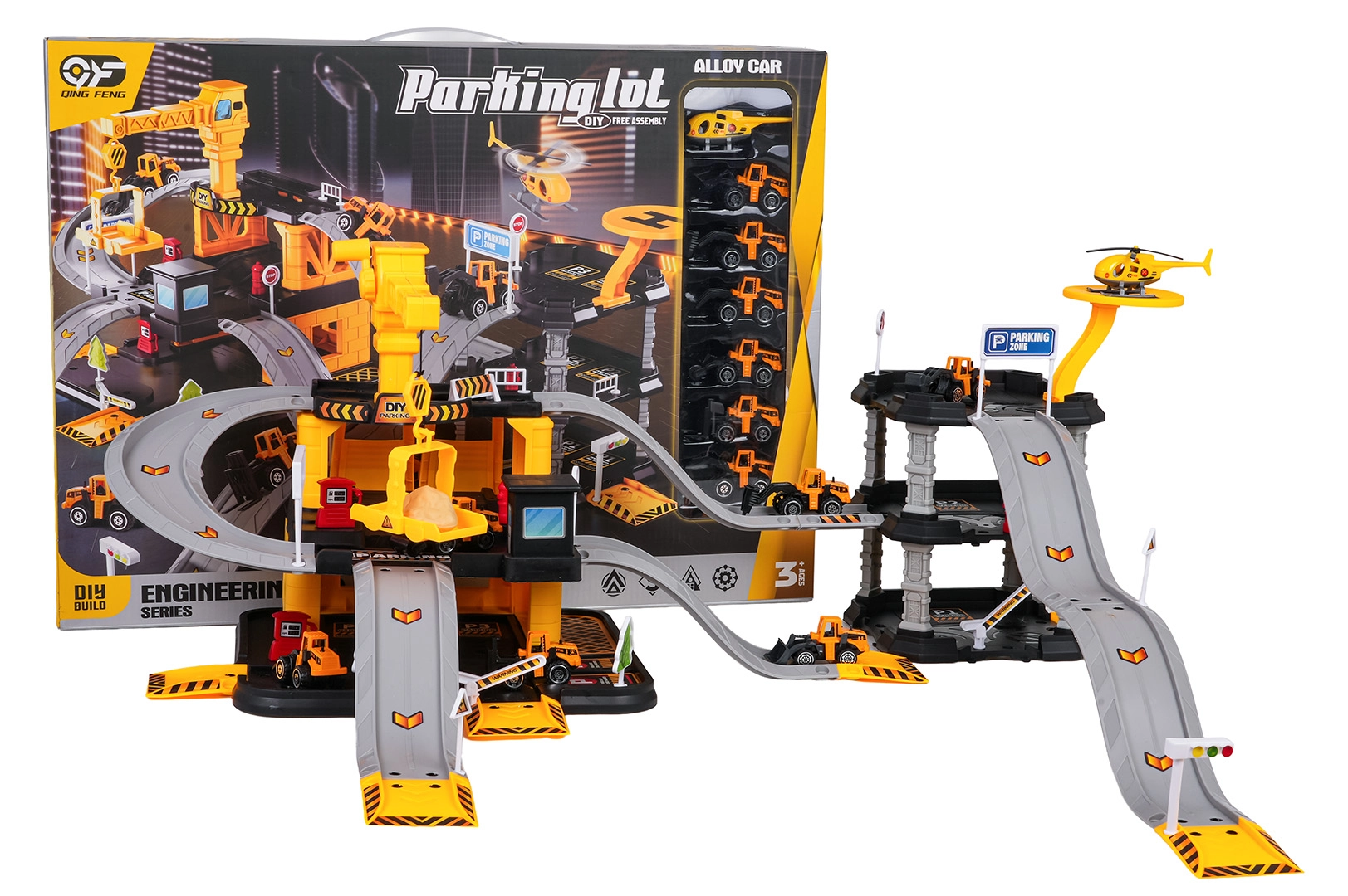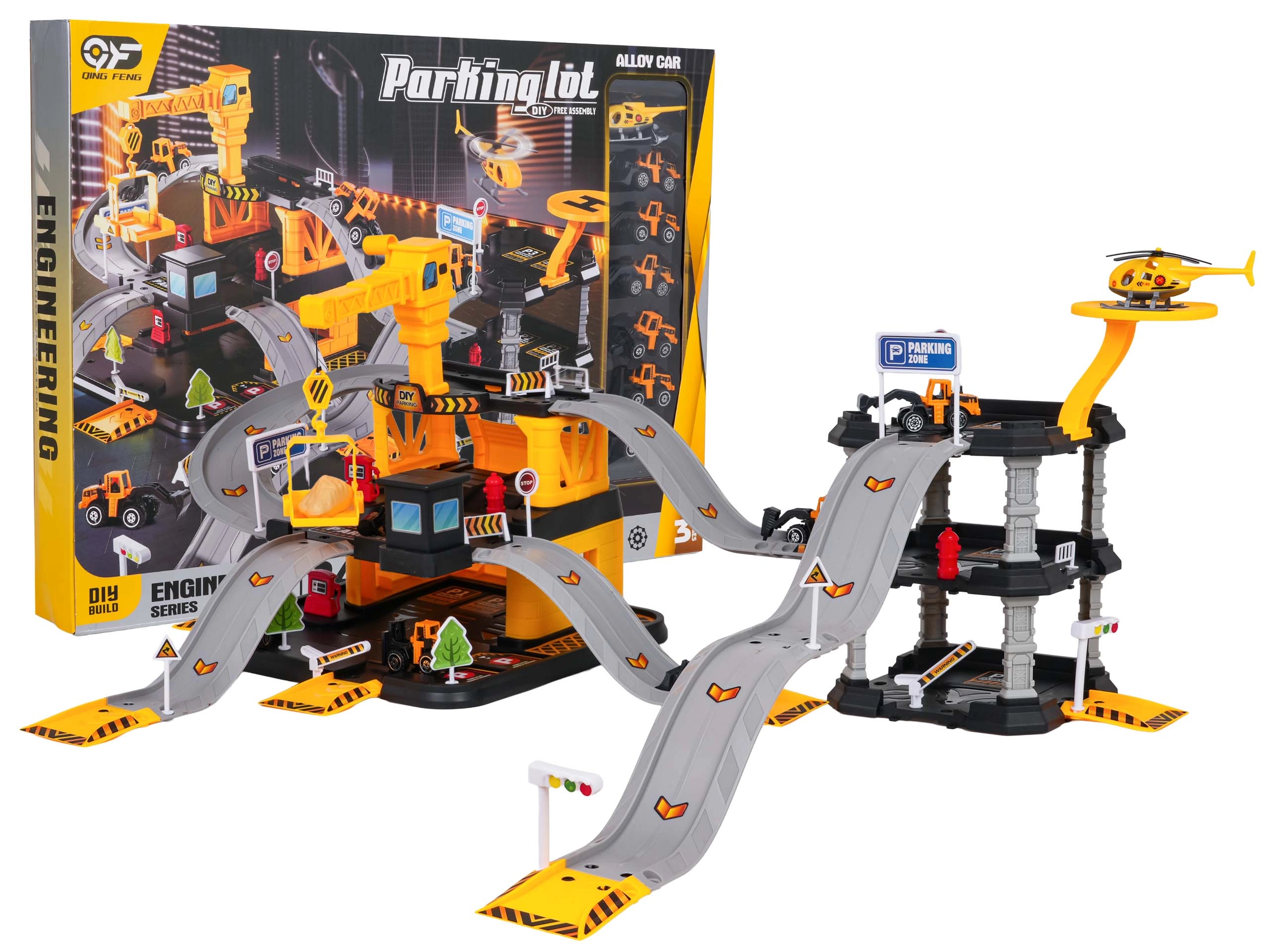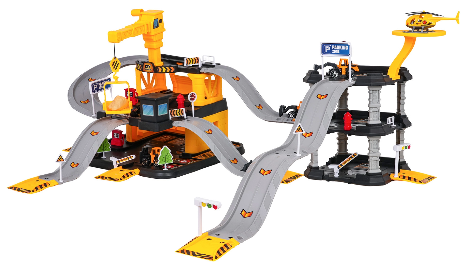 Trojposchodové parkovisko s heliportom je prepojené trojposchodovým staveniskom s rampami a žeriavom. Deti môžu plynule jazdiť medzi zónami a vytvárať vlastné stavebné scenáre.
