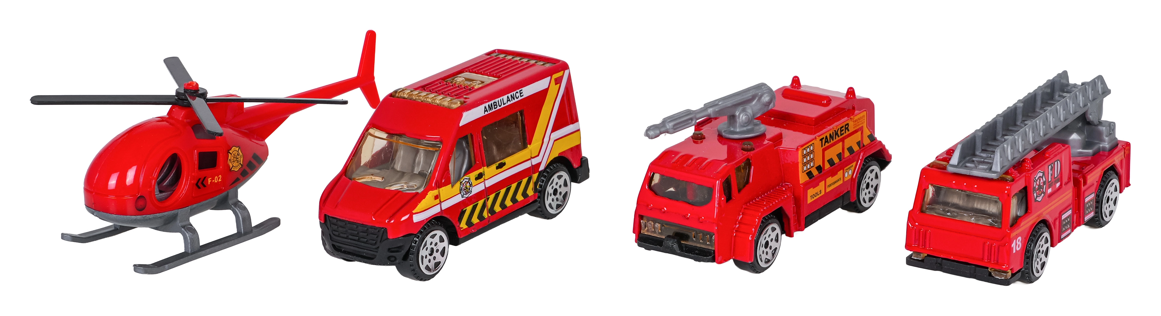 Tri odolné kovové autíčka s pohyblivými prvkami a detailná helikoptéra rozširujú herné možnosti a realistickosť akcie.