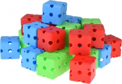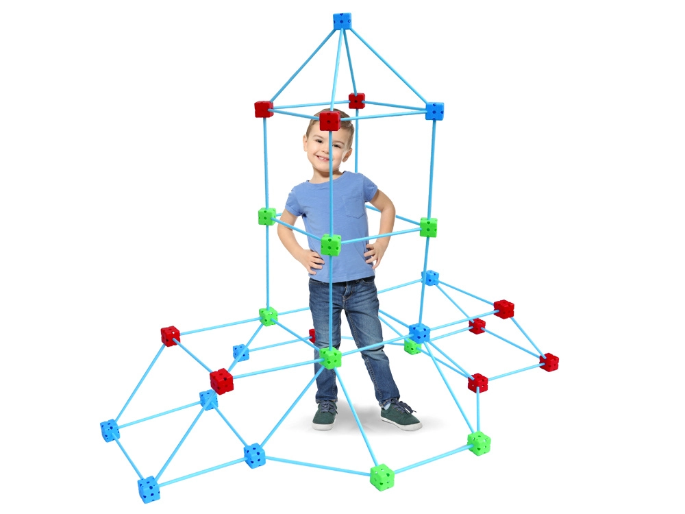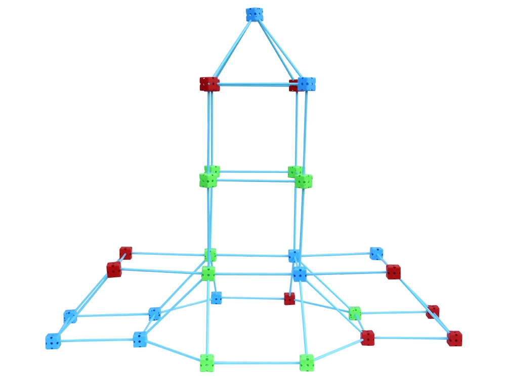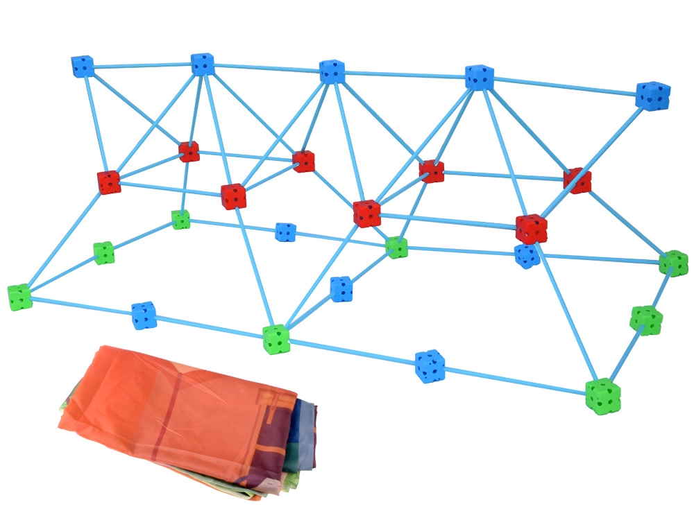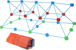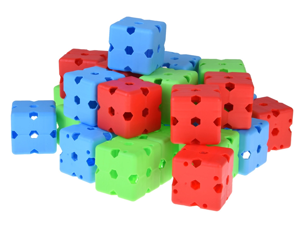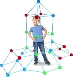 Farebné kocky s viacsmerovými otvormi umožnia spájať tyčky pod rôznymi uhlami. Vďaka tomu ľahko postavíte veže, kupoly aj rozmerné hracie fortíky.