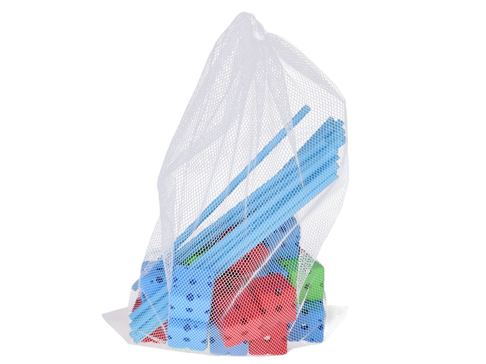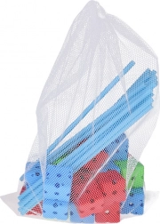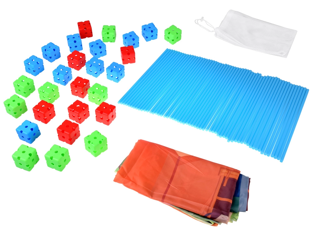 - 58× tyčka (cca 38 cm dĺžka, cca 1 cm priemer), 29× spojovacia kocka (cca 5 × 5 × 5 cm), 1× textilná plachta s potlačou (cca 230 × 155 cm), 1× sieťované úložné vrecko