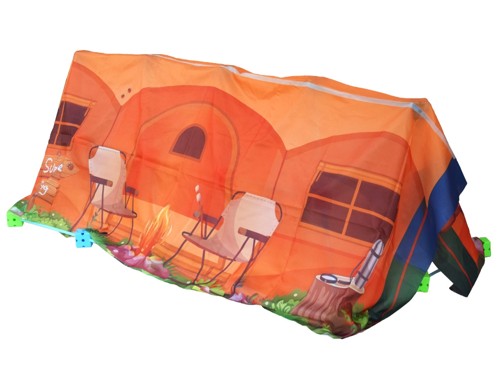 Súčasťou je farebná textilná plachta s motívom kempovania. Jednoducho ju prehodíte cez konštrukciu a vytvoríte útulné miesto na hru.