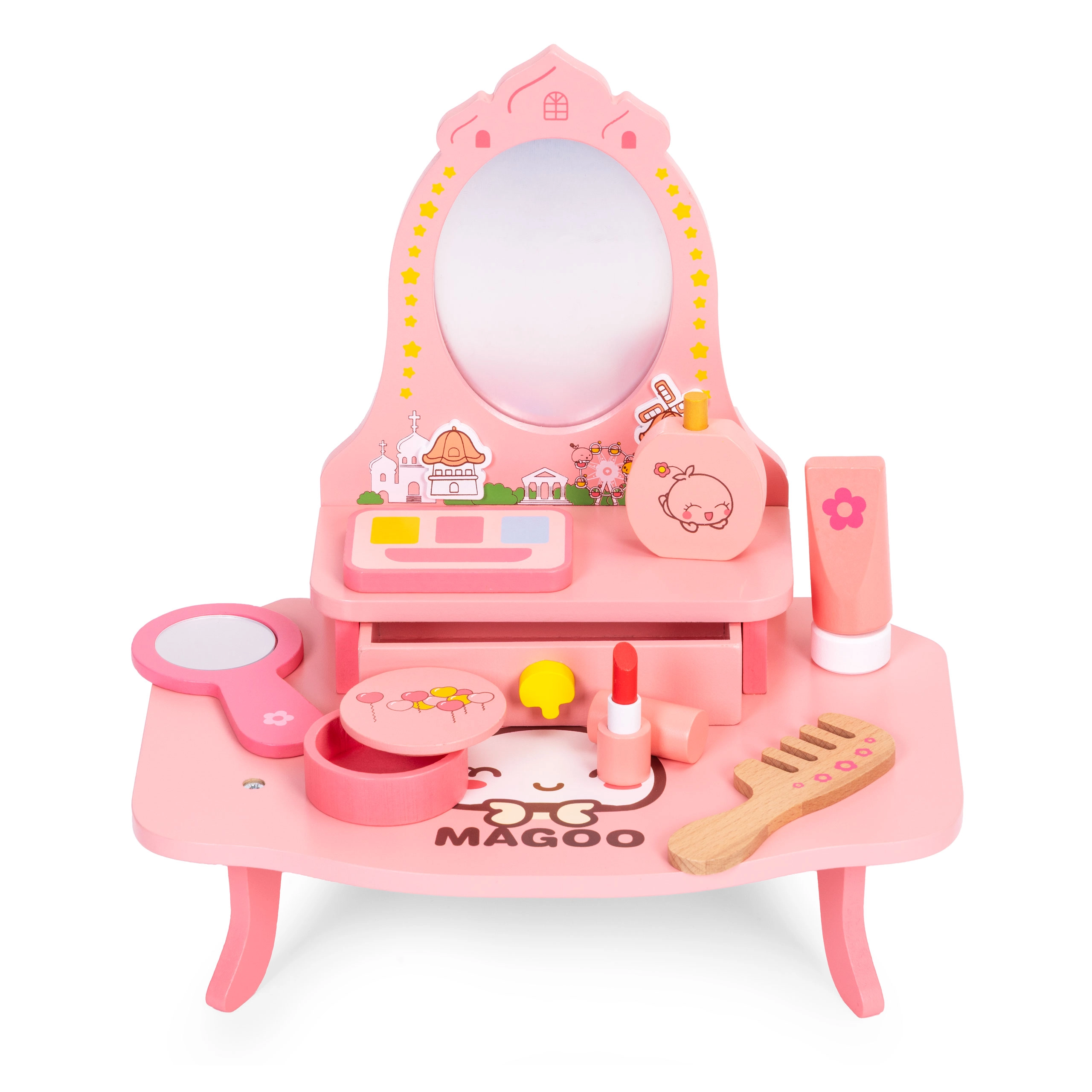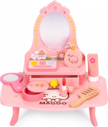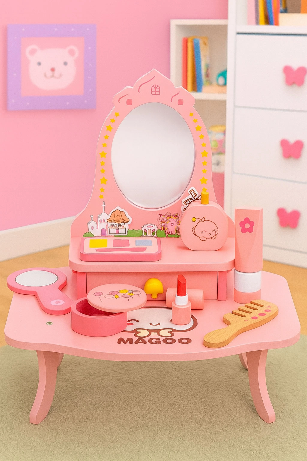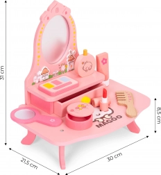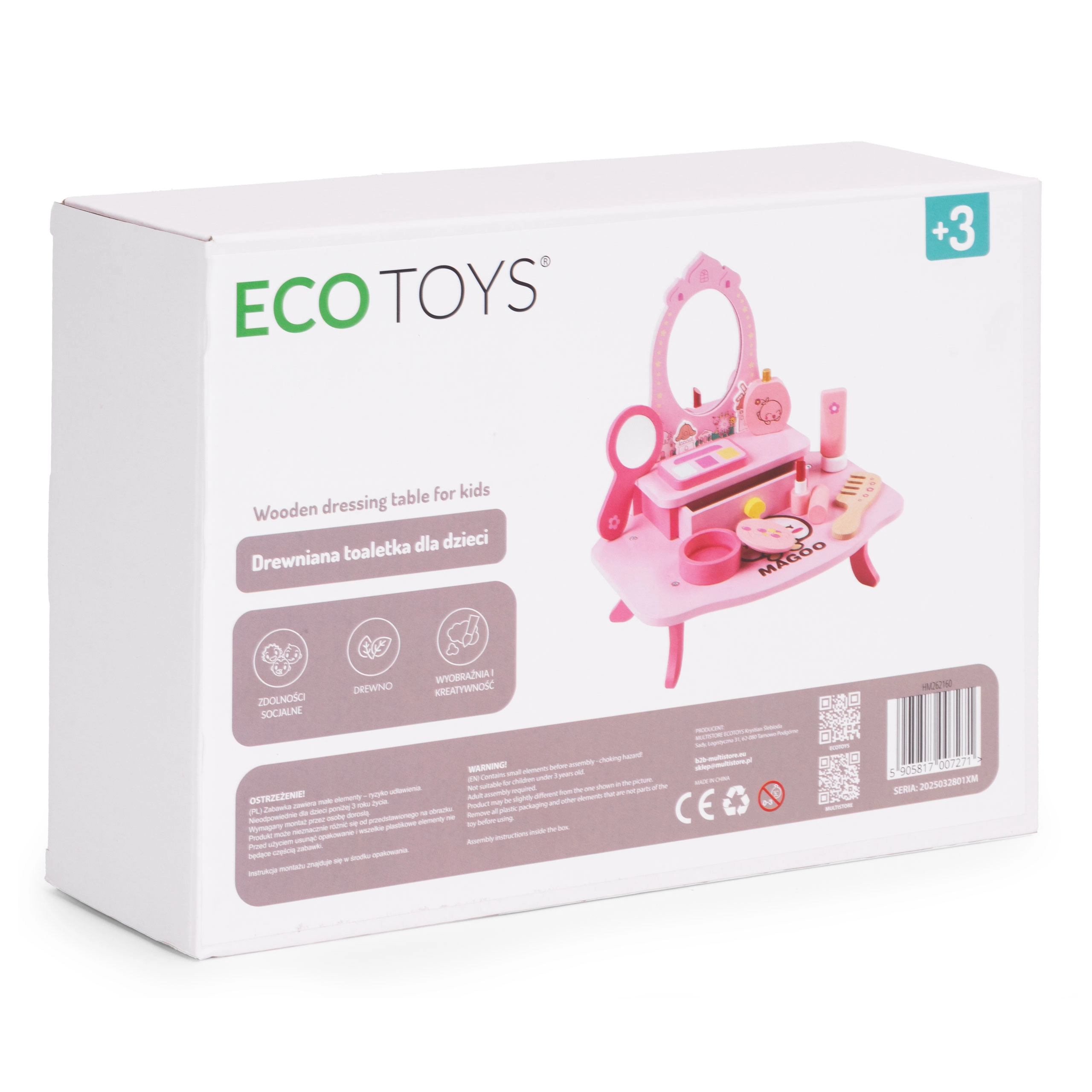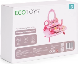 Roztomilý drevený toaletný stolík ECOTOYS je ideálny pre deti od 3 rokov. Má pevnú, pre deti bezpečnú konštrukciu, veľké zrkadlo s dekoratívnym rámom a praktickú zásuvku na drobnosti. Súčasťou je 7 herných kozmetických doplnkov, ktoré podporujú rozvoj jemnej motoriky, fantázie a napodobňovanie dospelých.