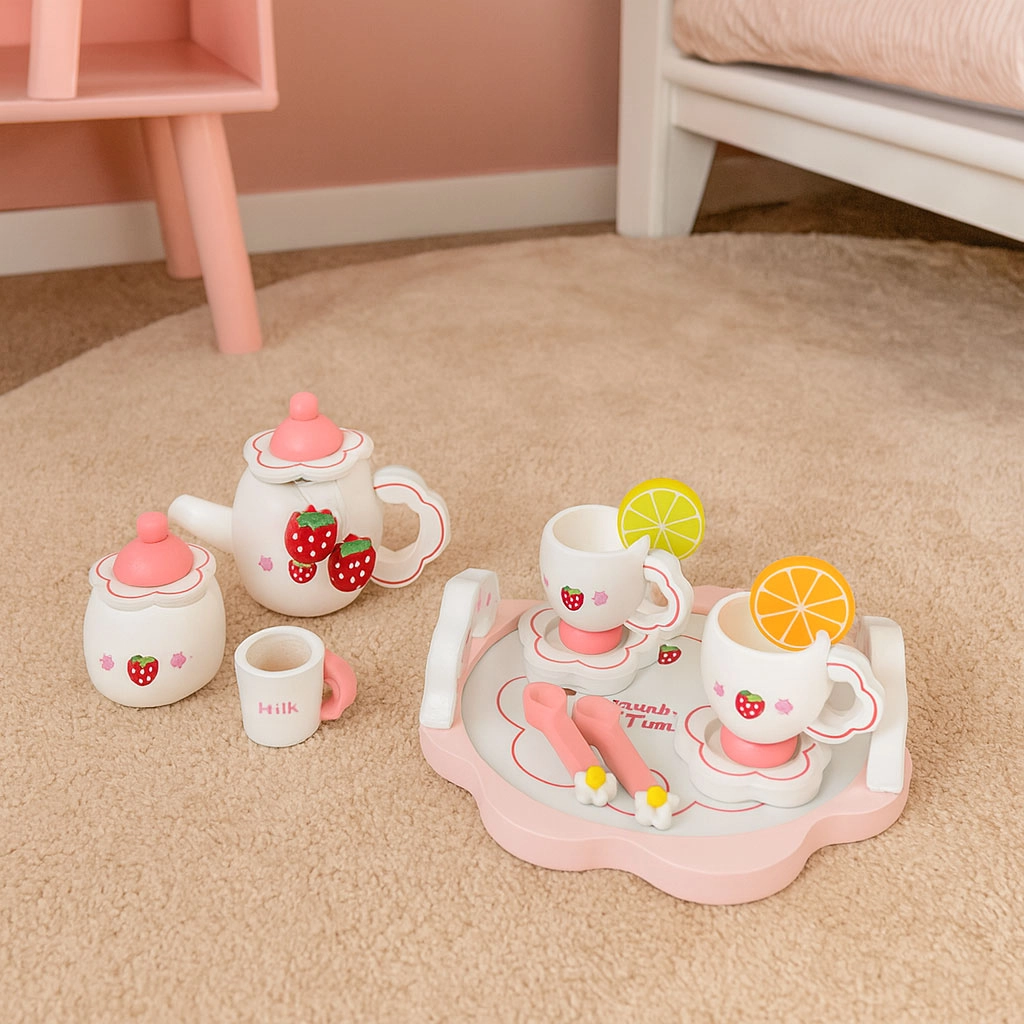 Objavte čaro čajového posedenia s drevenou sadou ECOTOYS inšpirovanou roztomilým jahodovým motívom. Set realisticky napodobňuje skutočné servírovanie – od kanvičky a cukorničky až po plátky citróna a pomaranča. Všetky časti sú z kvalitného dreva, majú zaoblené hrany a padnú do detských rúčok.