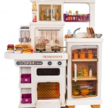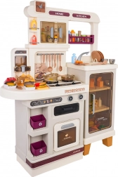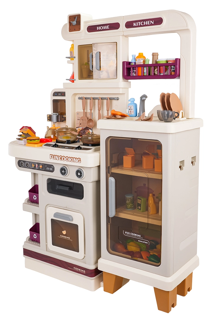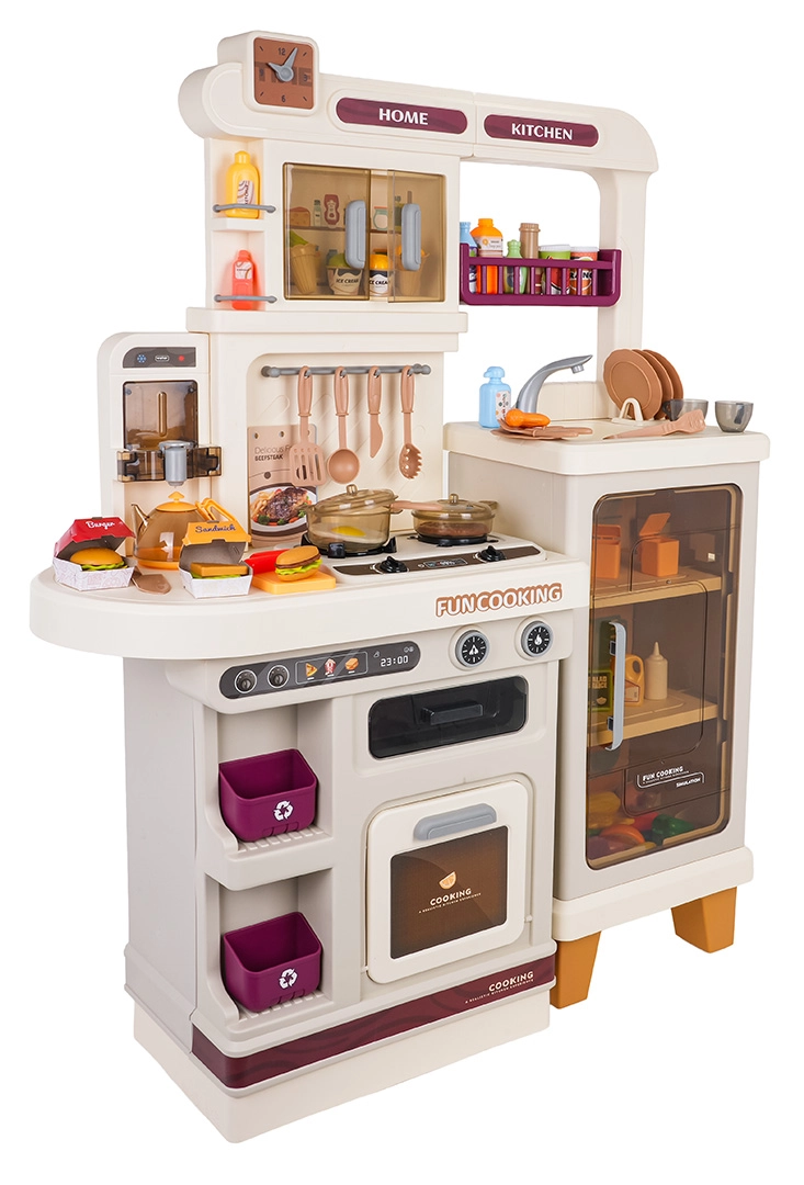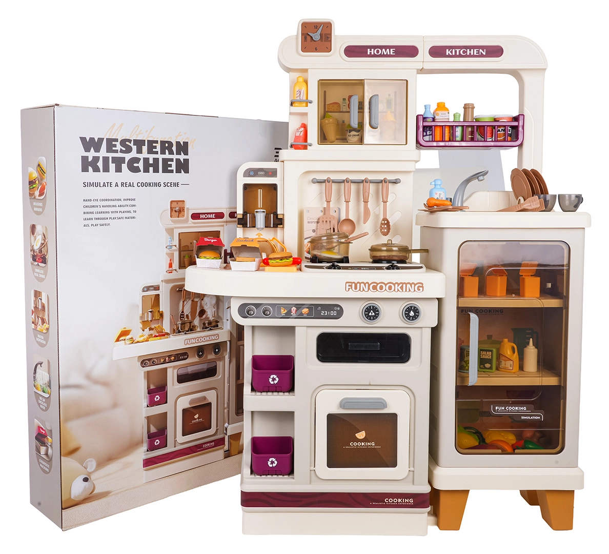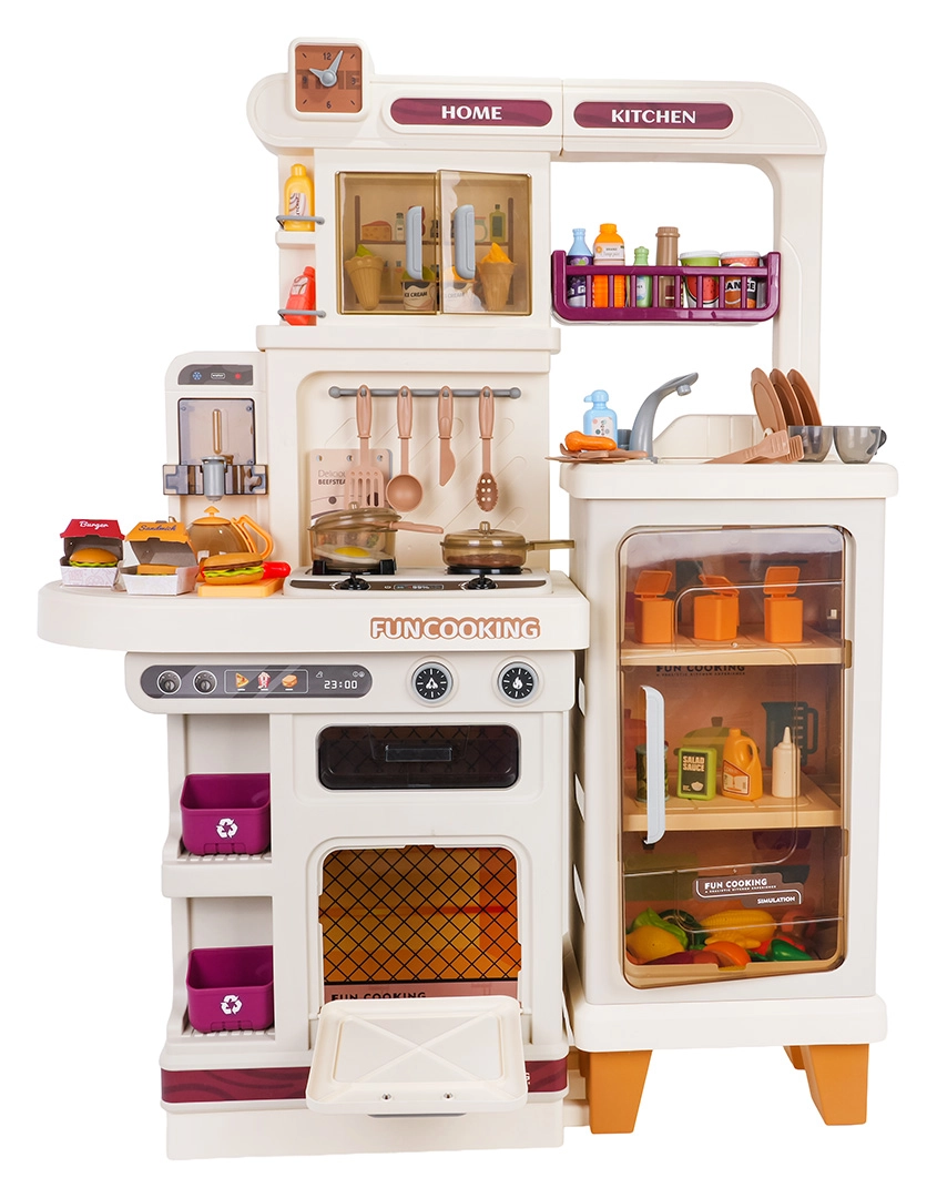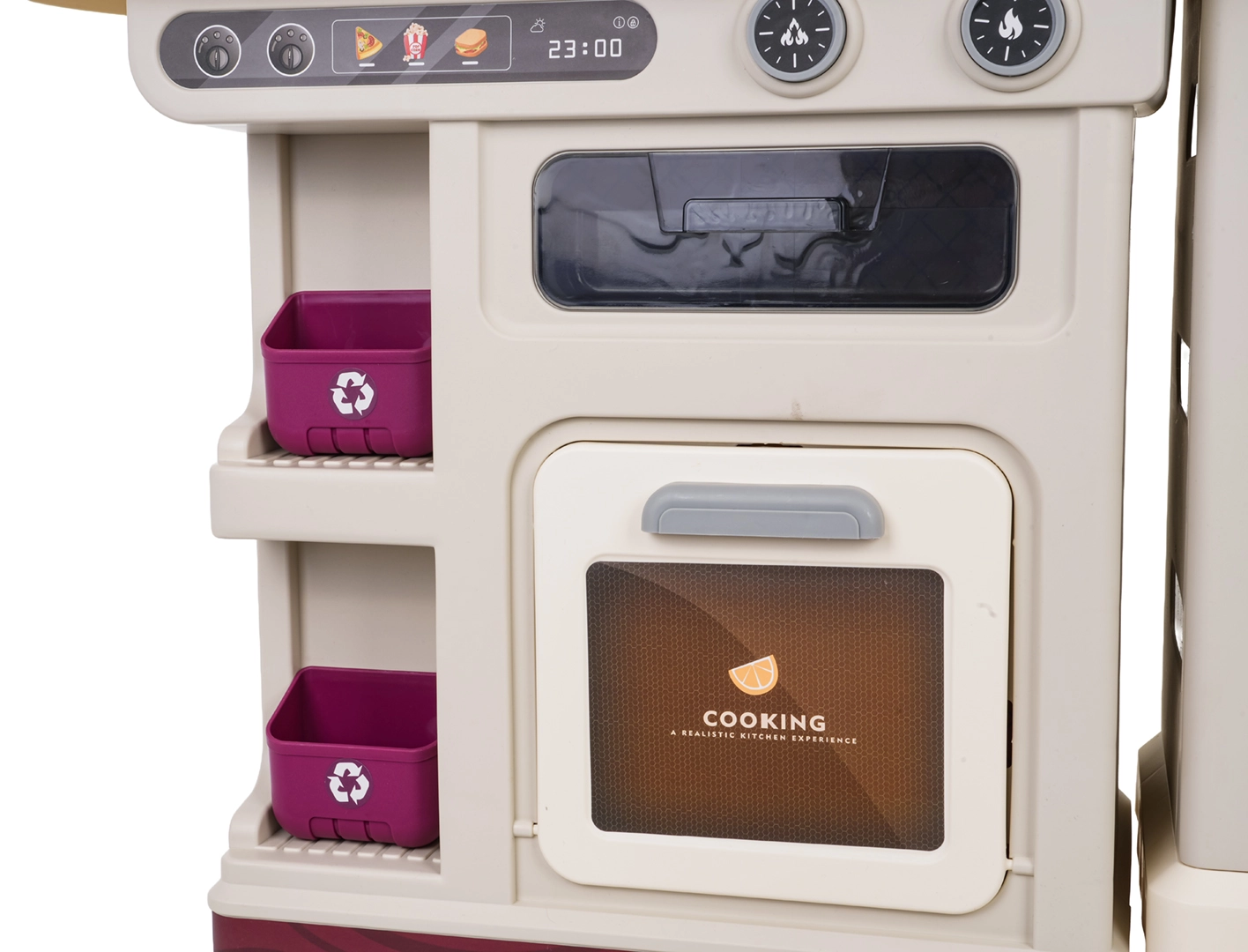 Táto multifunkčná kuchynka v elegantnej béžovej farbe je vyrobená z kvalitného, odolného plastu a nadchne každé dieťa realistickými funkciami. Podsvietené horáky vydávajú zvuky varenia a vyprážania, z jedného horáka sa dvíha jemná para a z funkčného kohútika tečie voda. Otváracia rúra a chladnička spolu s policami a háčikmi udržia všetky doplnky prehľadne na svojom mieste.