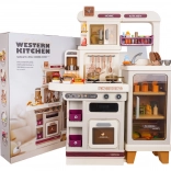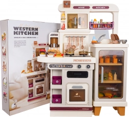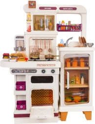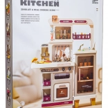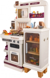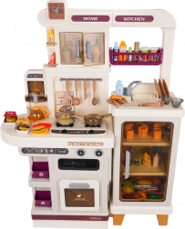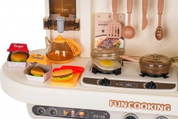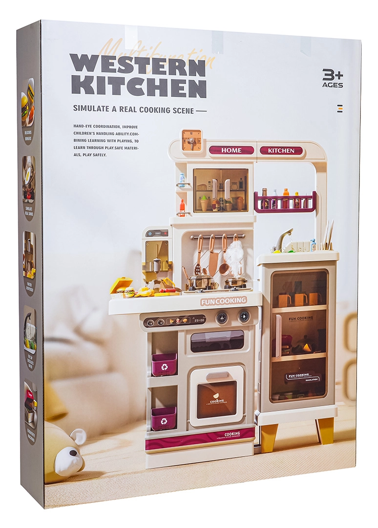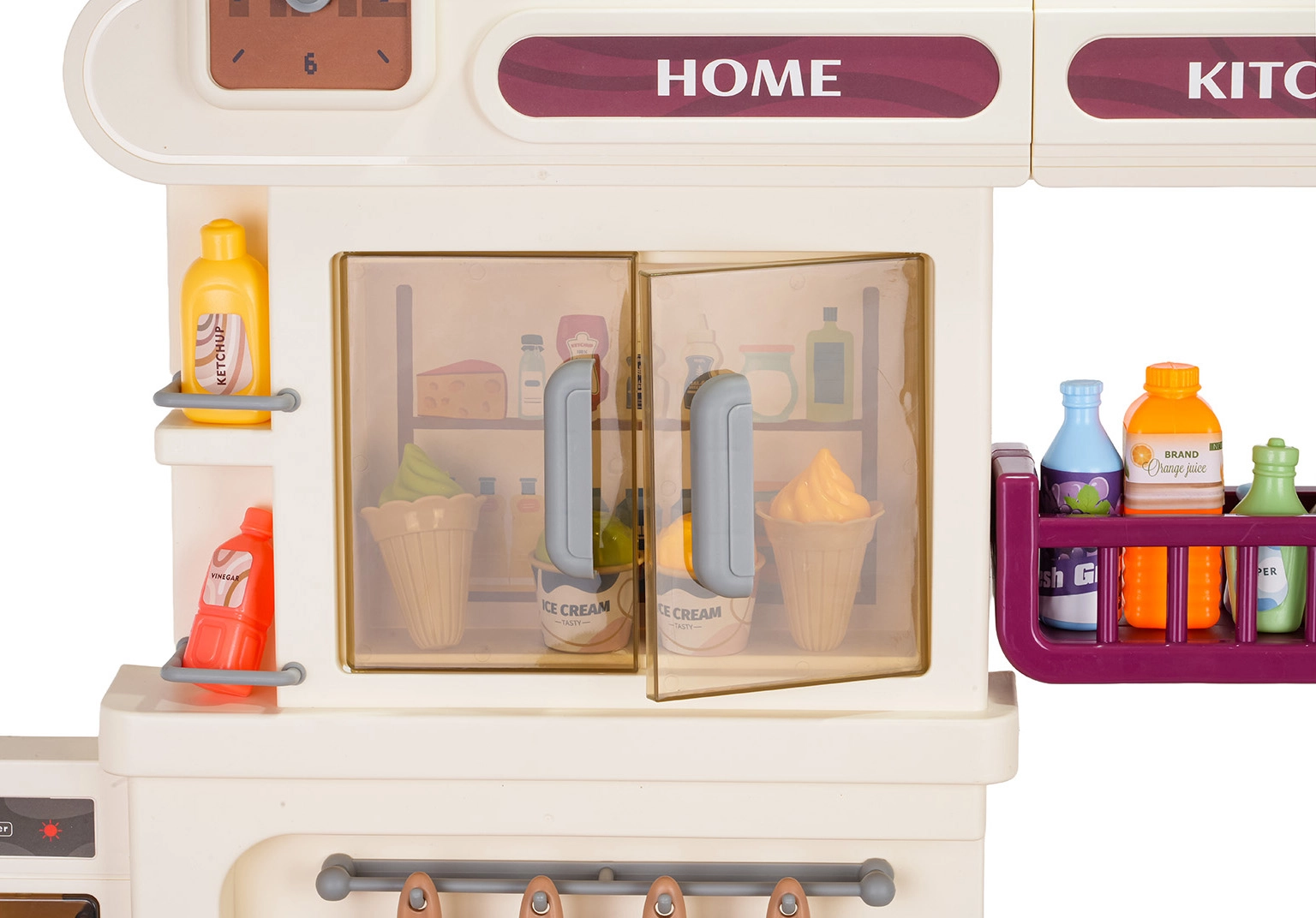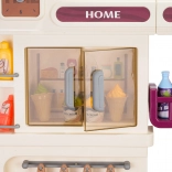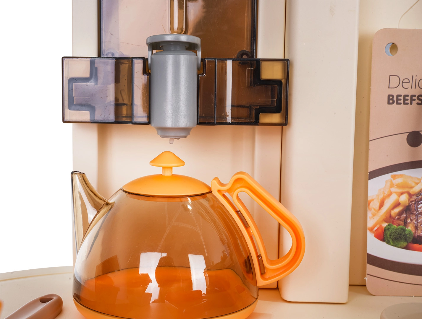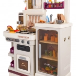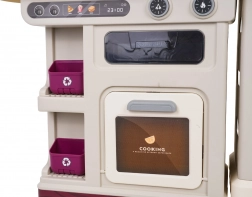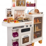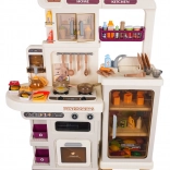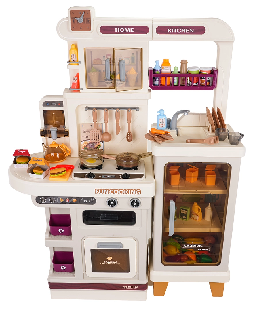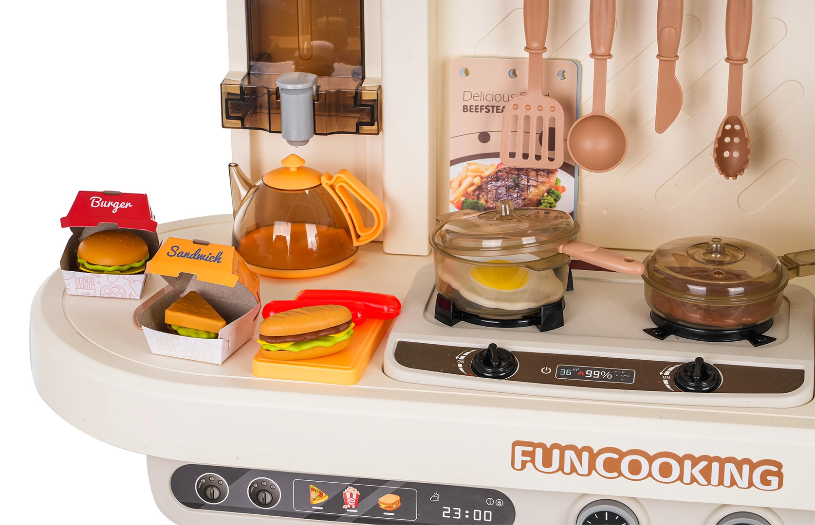 Táto multifunkčná kuchynka v elegantnej béžovej farbe je vyrobená z kvalitného, odolného plastu a nadchne každé dieťa realistickými funkciami. Podsvietené horáky vydávajú zvuky varenia a vyprážania, z jedného horáka sa dvíha jemná para a z funkčného kohútika tečie voda. Otváracia rúra a chladnička spolu s policami a háčikmi udržia všetky doplnky prehľadne na svojom mieste.