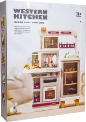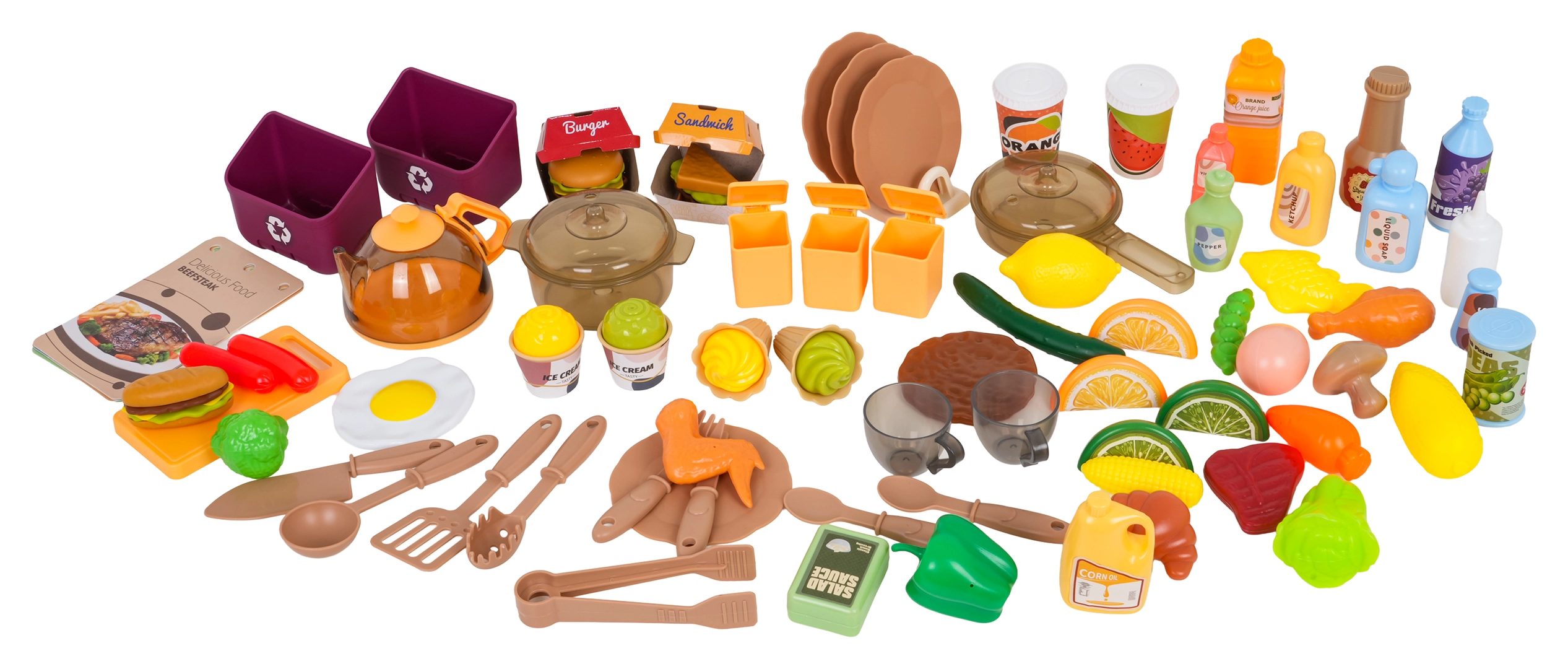 V balení nájdete 93 dielov – hrnce, panvicu, kanvičku, riad, príbory, kuchynské náradie, koreničky, odpadkové koše aj bohatý výber potravín a nápojov. Nechýbajú hodiny s pohyblivými ručičkami a menu kartičky pre ešte väčšiu porciu fantázie. Kuchynka je ideálna na rozvoj jemnej motoriky, sociálnych zručností a kreatívnej hry.