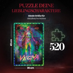 V balení nájdete všetko potrebné na zostavenie a vystavenie hotového diela: puzzle 520 dielikov, tvrdý kartón na podklad, lepidlo, montážny plastový rám, elektronický modul a RGB LED pásik, rovnako ako referenčný plagát a návod. Po zložení má obraz rozmer cca 36 × 49 cm a skvele sa hodí ako dekorácia s efektom prekrytia troch farebných úrovní.