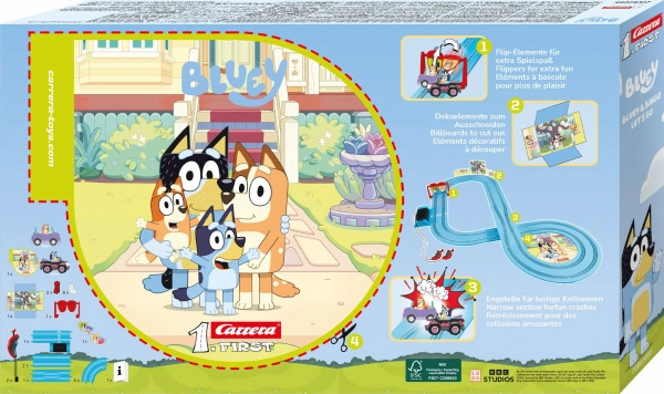 Vstúpte do sveta pretekov s autodráhou CARRERA First Bluey – ideálny prvý pretekársky set pre malých pretekárov. Dráha v mierke 1:50 ponúka dynamickú trať s rovinkami a zákrutami, štart/cieľ bránou a bohatou výzdobou s obľúbenými postavičkami BLUEY a BINGO. Vďaka batériovej prevádzke je set perfektný na domácu aj cestovnú zábavu.