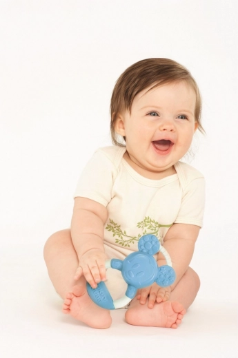 Textúrovaný povrch hryzátka podporuje senzorické vnímanie a rozvoj jemnej motoriky. Ergonomický tvar s istým úchopom motivuje dieťa k samostatnému držaniu a bezpečnému skúmaniu.