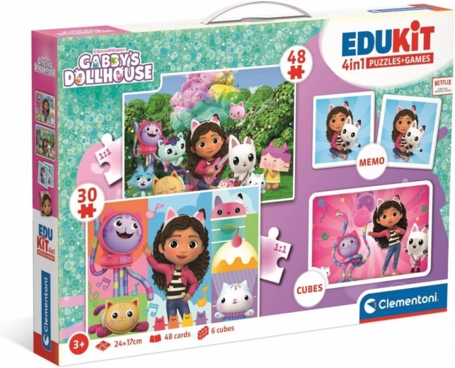 Vzdelávacia sada EduKit 4 v 1 Gabiin mačací domček prináša štyri obľúbené aktivity v jednom balení. Deti si užijú skladanie dvoch puzzle s 30 a 48 dielikmi, trénovanie pamäti s memo kartičkami a stavenie z 6 kociek. Vďaka motívom z populárneho seriálu je každá hra zábavná, farebná a motivujúca.