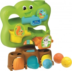Tento farebný stromček s priateľskými zvieracími motívmi je ideálna prvá logická hračka pre batoľatá. Dieťa vkladá guličky do otvoru v korune stromu a sleduje ich cestu po dráhe. Každá gulička sa objaví za dvierkami zodpovedajúcej farby, čo prirodzene rozvíja koordináciu oko–ruka, rozpoznávanie farieb a pochopenie príčiny a následku.