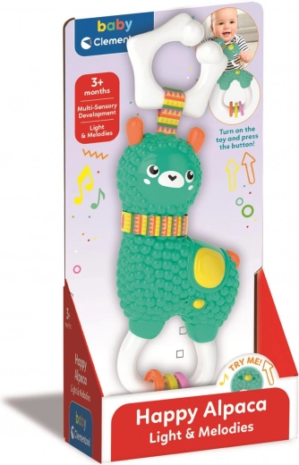 Roztomilá interaktívna hrkálka v tvare alpaky od BABY CLEMENTONI poteší bábätká od 3 mesiacov. Ponúka podsvietené tlačidlo s melódiami a zvukovými efektmi, farebné prívesky a rôzne textúry na rozvoj zmyslov. Vďaka praktickému krúžku ju ľahko pripevníte na postieľku, kočík či autosedačku.