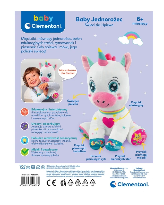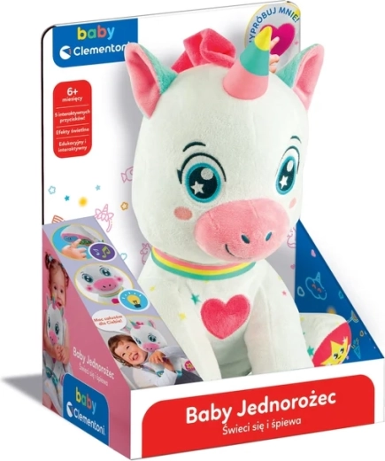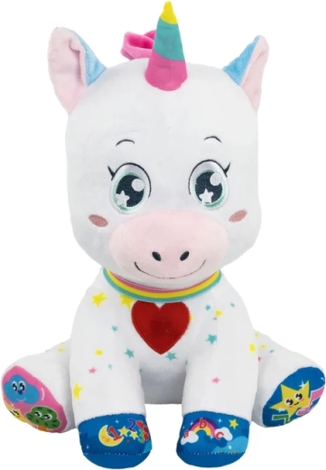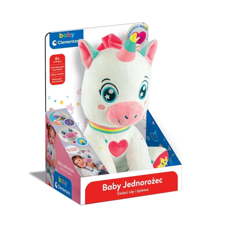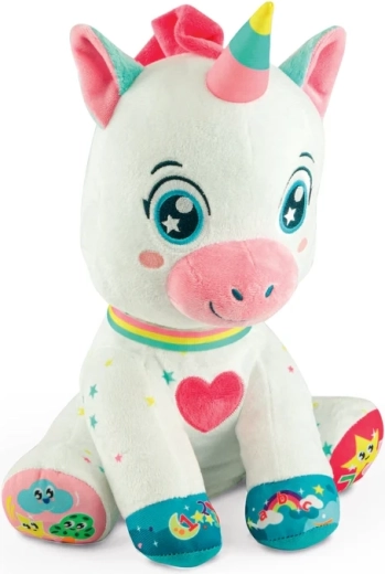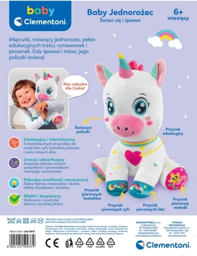 Roztomilý interaktívny jednorožec od BABY CLEMENTONI poteší deti od 6 mesiacov. Má 5 dotykových tlačidiel na labkách a srdiečku, ktoré spúšťajú zvuky, pesničky a riekanky a učia písmená, čísla, tvary a farby. Mäkké, netoxické materiály, podsvietené líčka a svietiaci roh podporujú vizuálne vnímanie, jemnú motoriku a rozvoj slovnej zásoby.