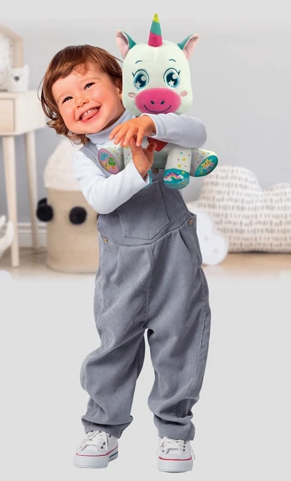 Interaktívny plyšový jednorožec je skvelým parťákom na prvé objavovanie sveta. Vďaka piatim chytrým tlačidlám deti hravou formou spoznávajú písmená, čísla, tvary a farby, zatiaľ čo veselé melódie a riekanky rozvíjajú sluch aj slovnú zásobu. Svietiace líčka a roh upútajú pozornosť a podporujú vizuálnu stimuláciu.