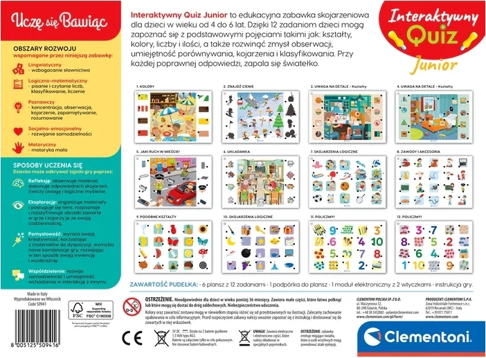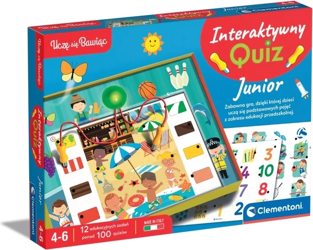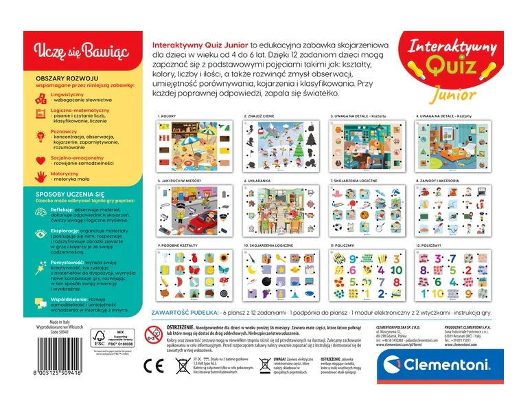 Objavte zábavnú vzdelávaciu hru pre najmenších! Interaktívny kvíz junior od Clementoni ponúka 12 aktivít a viac než 1000 ilustrovaných kvízov, ktoré deťom vo veku 4–6 rokov pomáhajú hravou formou rozvíjať poznávanie tvarov, farieb, čísel a množstva. Pri každej správnej odpovedi sa rozsvieti svetielko, ktoré motivuje k ďalšiemu učeniu.