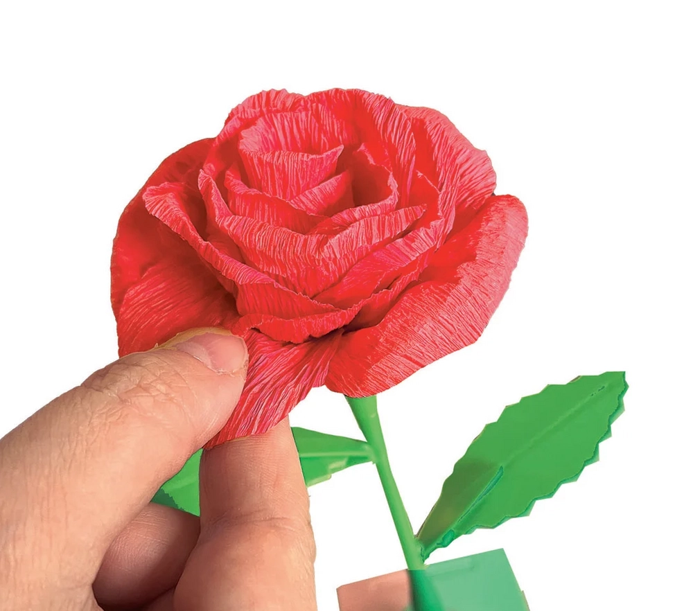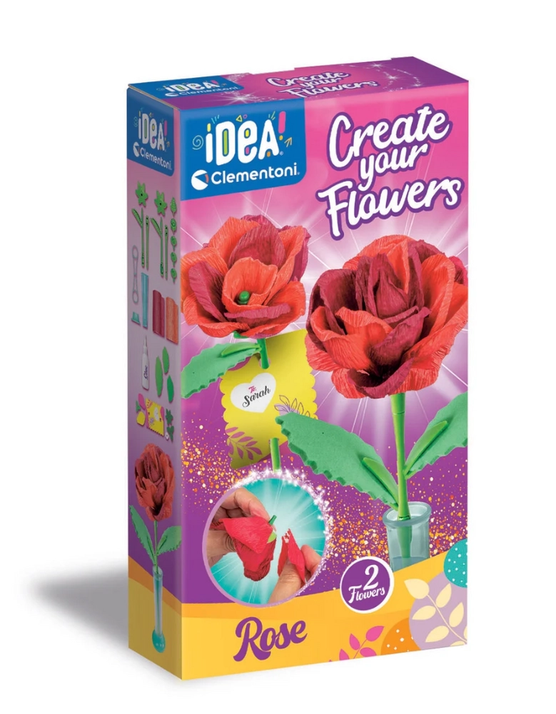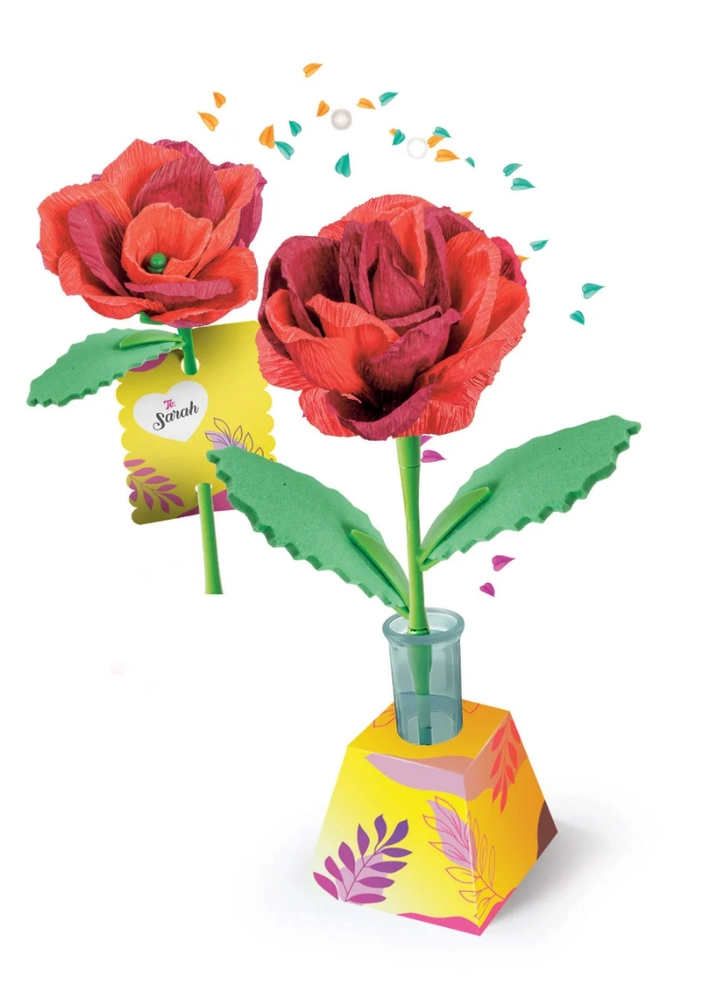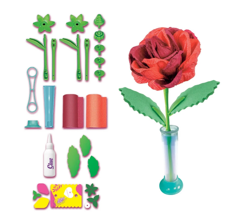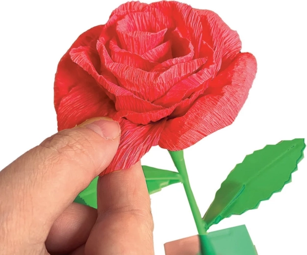 Objavte tvorenie, ktoré baví aj rozvíja. Sada Mini továreň na kvety – ruže obsahuje všetko potrebné na výrobu dvoch elegantných papierových ruží vrátane okvetných lístkov, stoniek a listov. Hotové kvety jednoducho umiestnite do dekoratívneho kartónového stojana, ktorý možno personalizovať menom alebo venovaním.