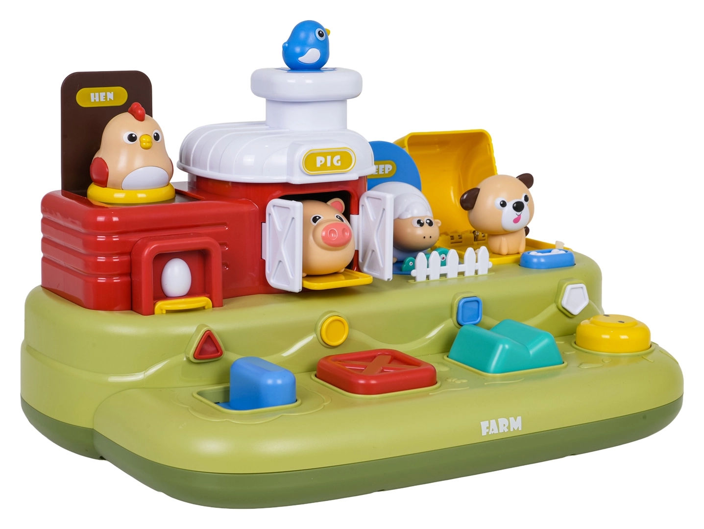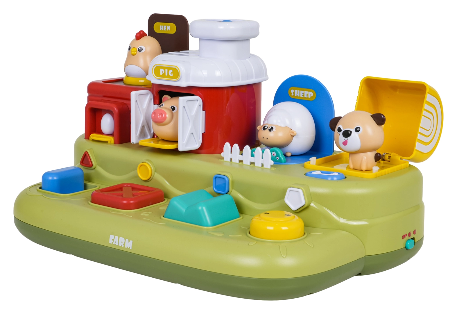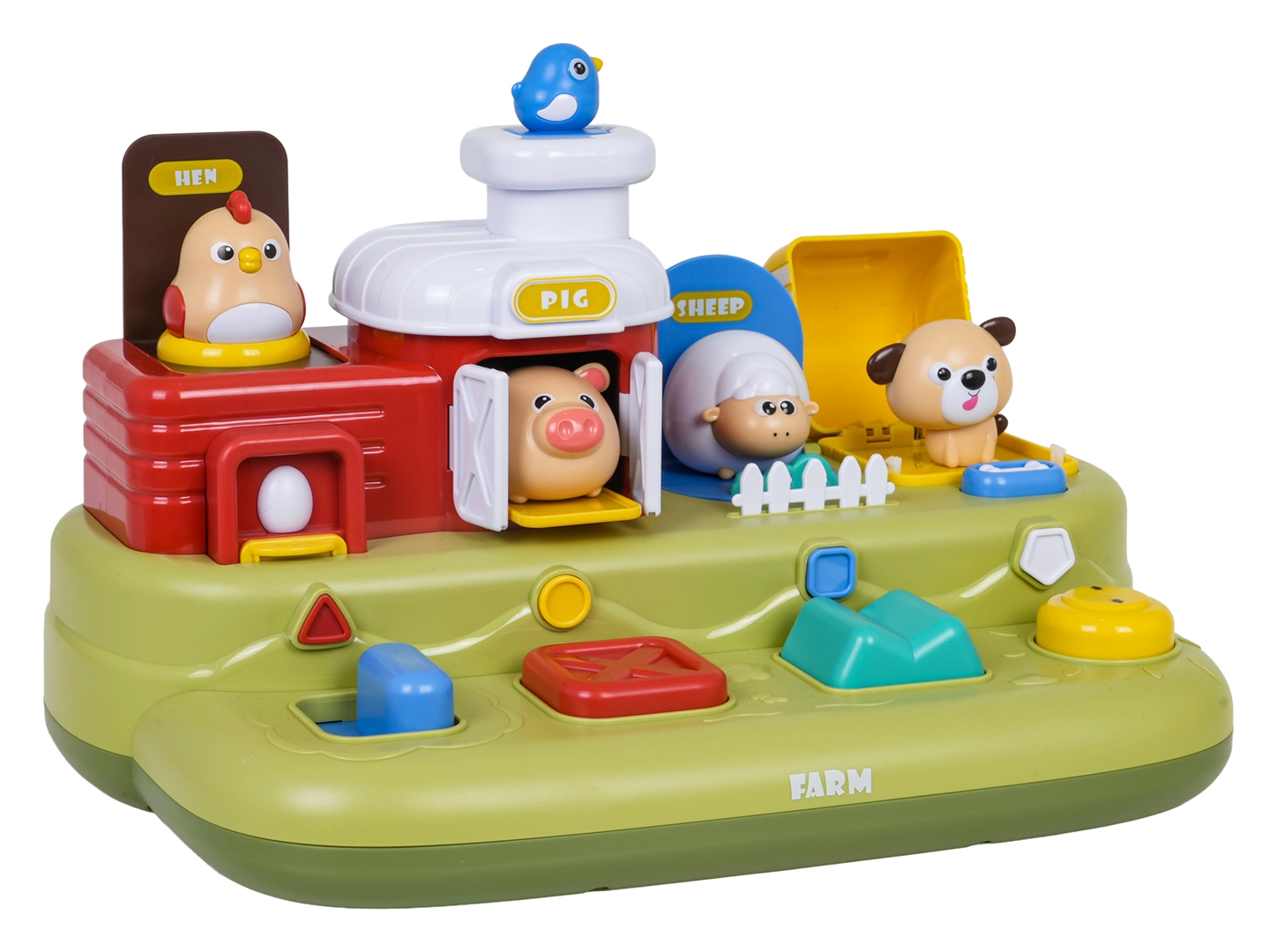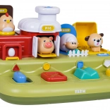Táto veselá farma prináša deťom množstvo objavovania: po posunutí modrého jazdca vyskočí kuriatko, po stlačení červeného tlačidla sa otvoria dvierka s prasiatkom, po stlačení zeleného sa objaví ovečka a po otočení žltého ovládača vykukne psík. Nad ovládacími prvkami sú ďalšie tlačidlá, ktoré spúšťajú melódie, zvuky zvieratiek a ďalšie efekty.