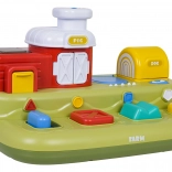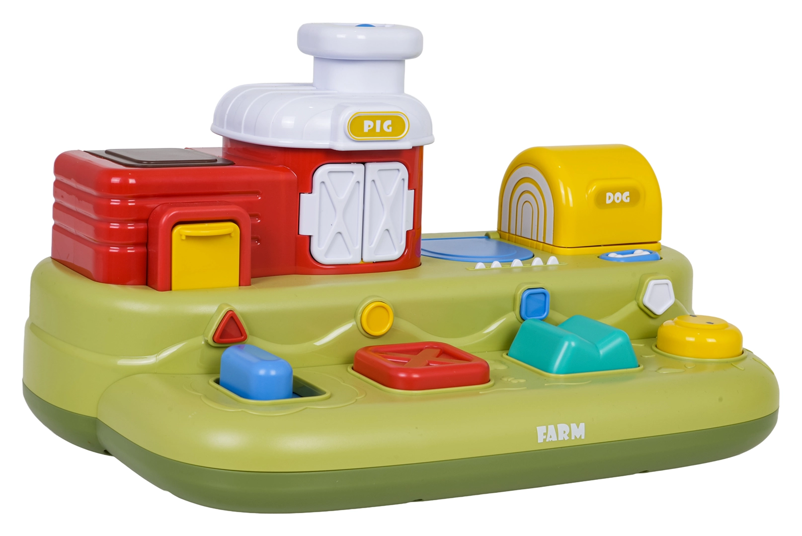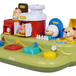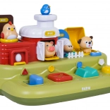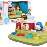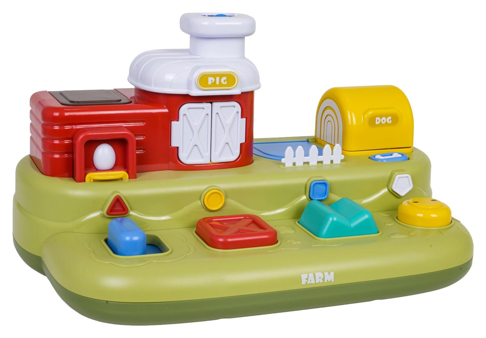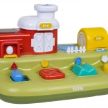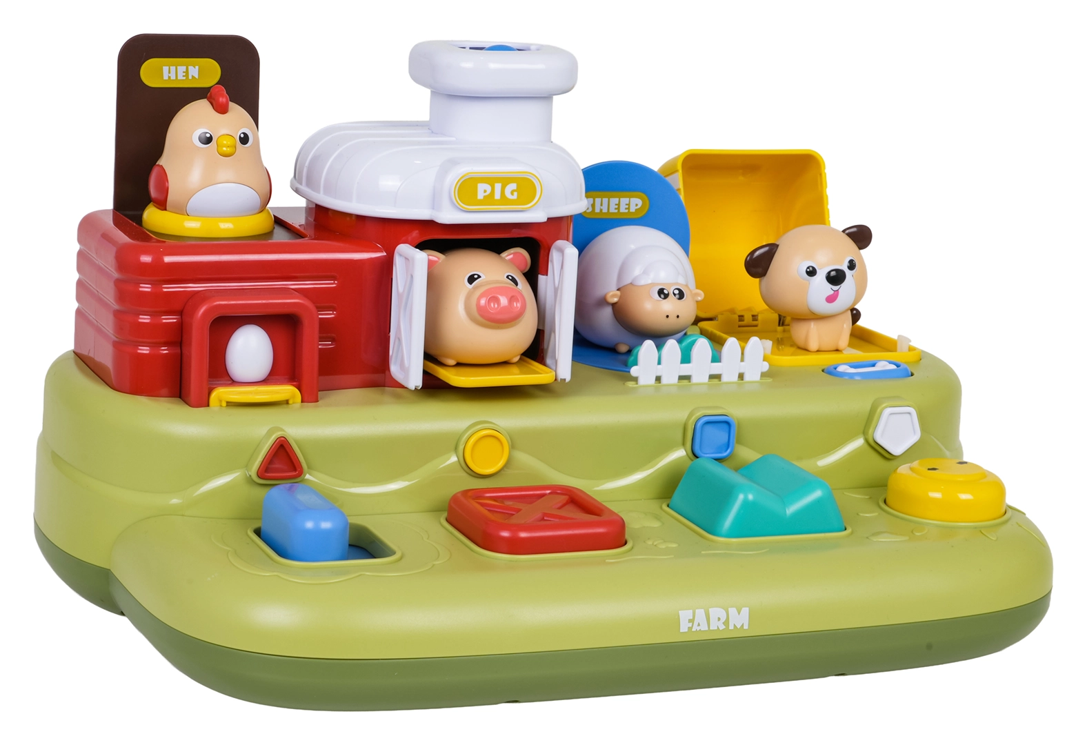 Táto veselá farma prináša deťom množstvo objavovania: po posunutí modrého jazdca vyskočí kuriatko, po stlačení červeného tlačidla sa otvoria dvierka s prasiatkom, po stlačení zeleného sa objaví ovečka a po otočení žltého ovládača vykukne psík. Nad ovládacími prvkami sú ďalšie tlačidlá, ktoré spúšťajú melódie, zvuky zvieratiek a ďalšie efekty.