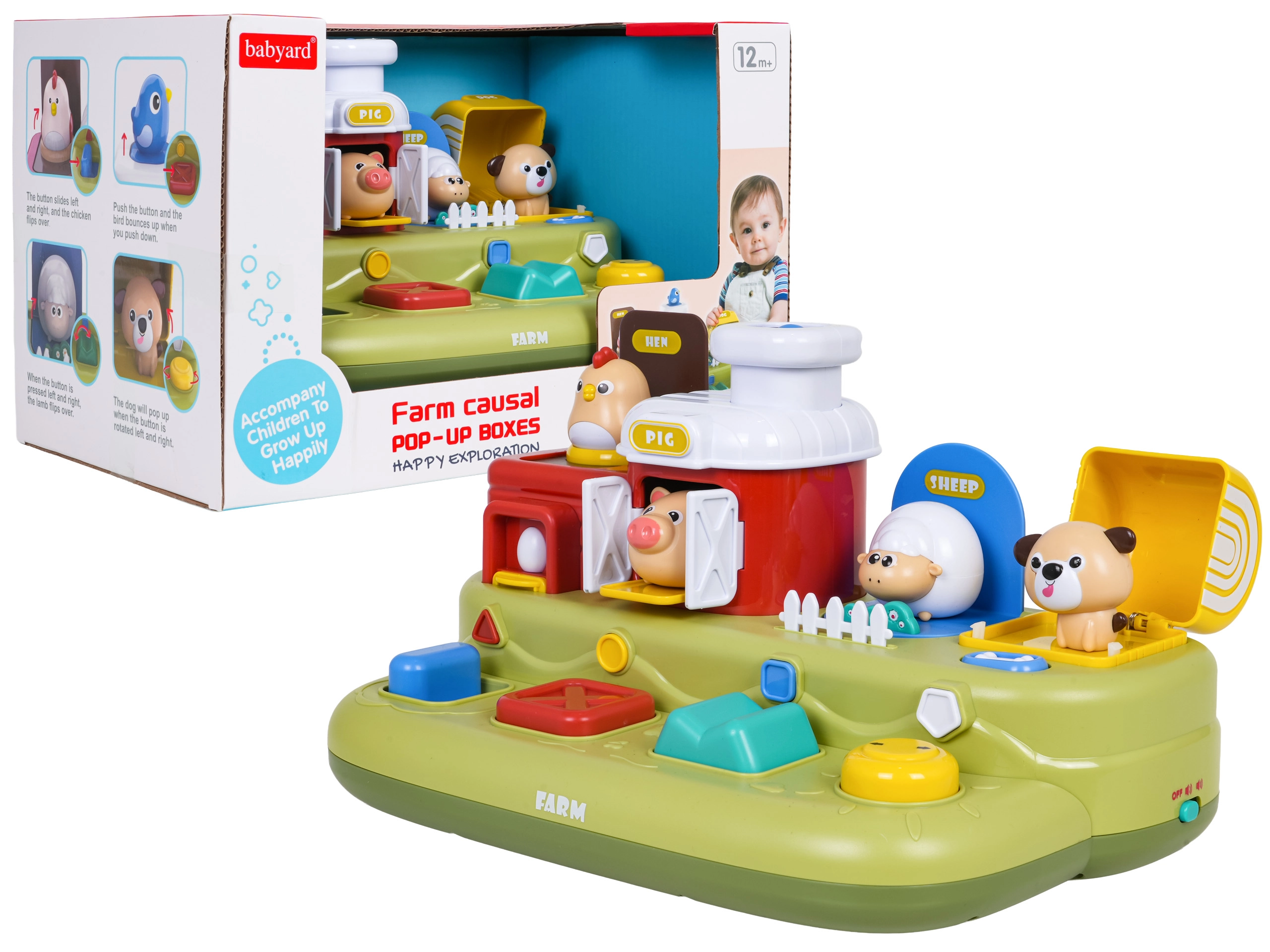 Farebná interaktívna farma so štyrmi vyskakovacími zvieratkami poteší deti od 12 mesiacov. Deti objavujú princíp príčina – následok, trénujú jemnú motoriku a učia sa zvuky zvierat. Veľké tlačidlá, posúvače a otočné prvky sú z bezpečných materiálov. Hračka ponúka melódie, zvukové efekty a reguláciu hlasitosti. Napájanie 3× AA (nie sú súčasťou).