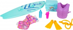 4 bábiky (mamička, otecko, dcéra, bábätko), surfovacia doska, záchranná vesta, plutvy, maska/kyslíkový set, plavky, chladiaca taška, 2 nápojové fľaštičky/poháriky, plávací kruh