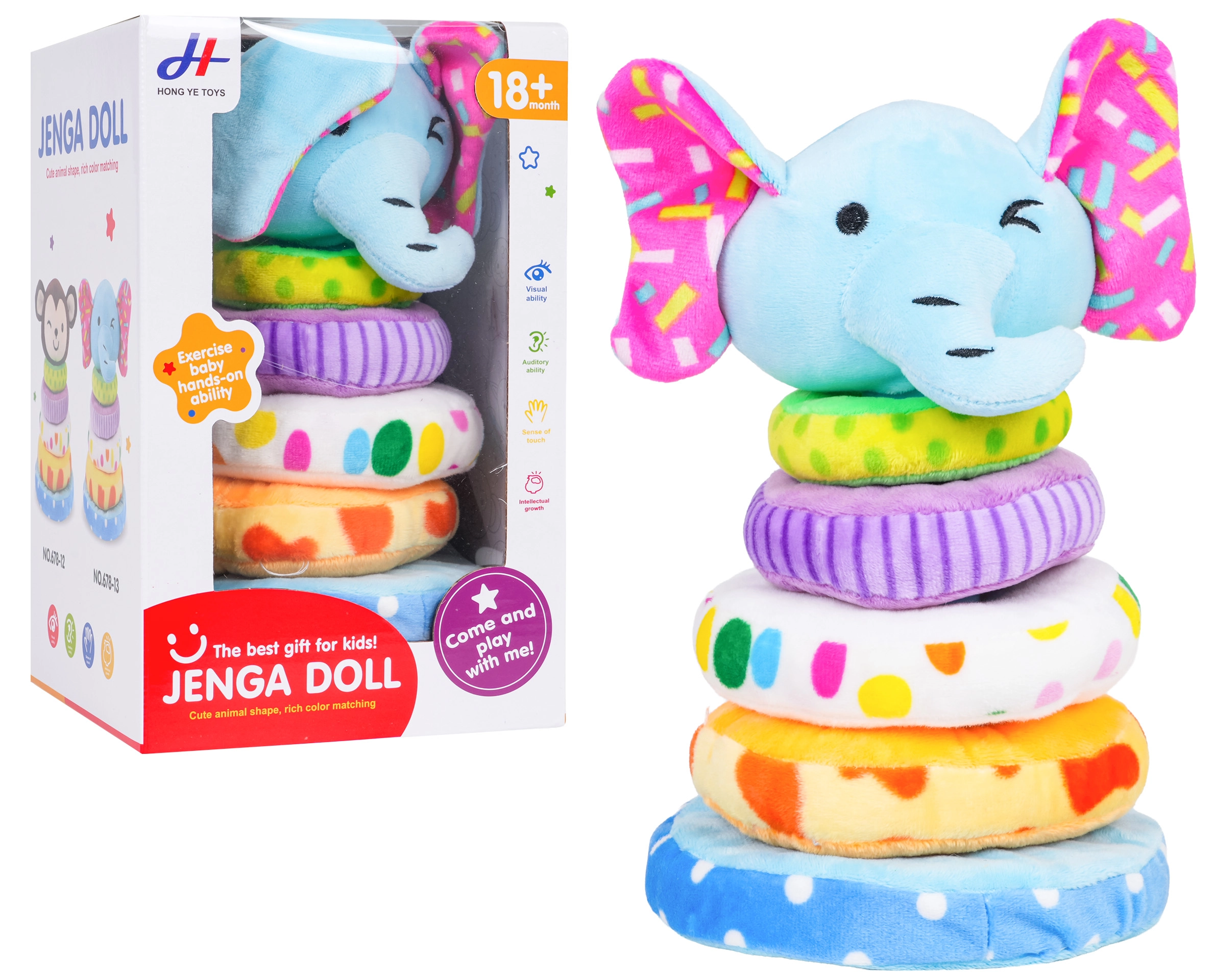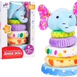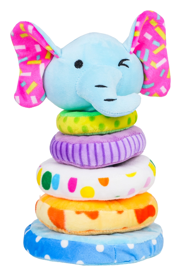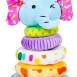 Táto mäkká plyšová pyramída v tvare slona je skvelou prvou edukatívnou hračkou. Deti si precvičia navliekanie 4 krúžkov rôznych veľkostí na mäkký tŕň a naučia sa triedenie podľa veľkosti aj farieb. Pískatko v hlave sloníčaťa odmení každý stisk veselým zvukom a rozvíja sluchové vnímanie.