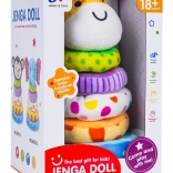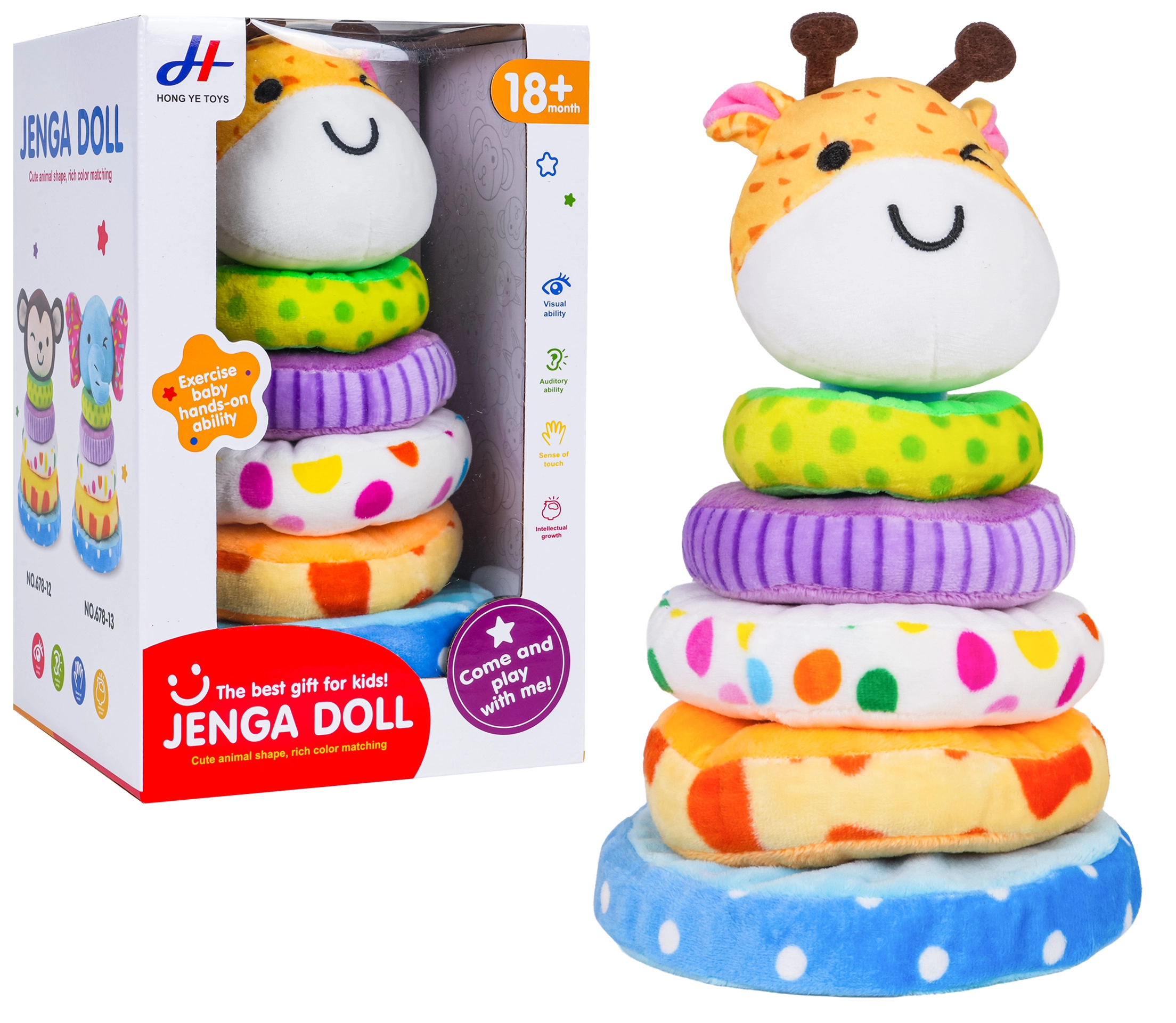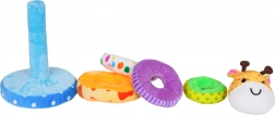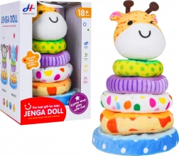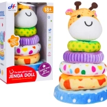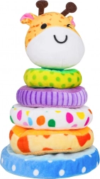Mäkká skladacia pyramída žirafa prináša deťom zábavnú a bezpečnú formu učenia. Set tvorí stabilná základňa, štyri hebké krúžky rôznej veľkosti a hlavička žirafy s píšťalkou. Pestrofarebné vzory a príjemný plyš podporujú zmyslový rozvoj, zatiaľ čo skladanie krúžkov trénuje logiku a trpezlivosť.