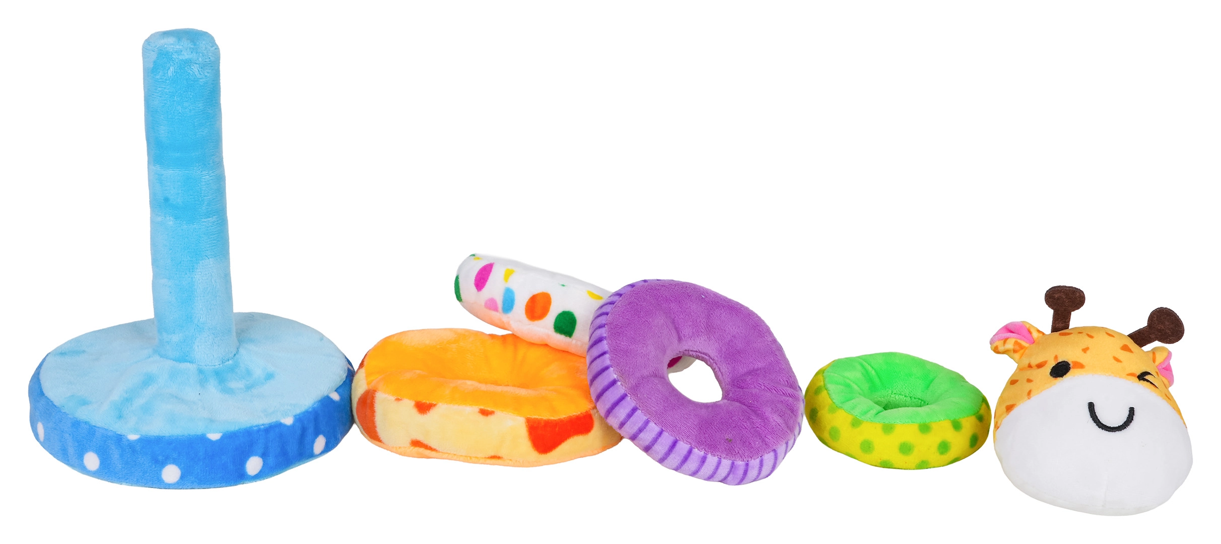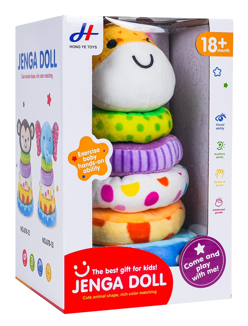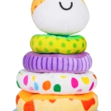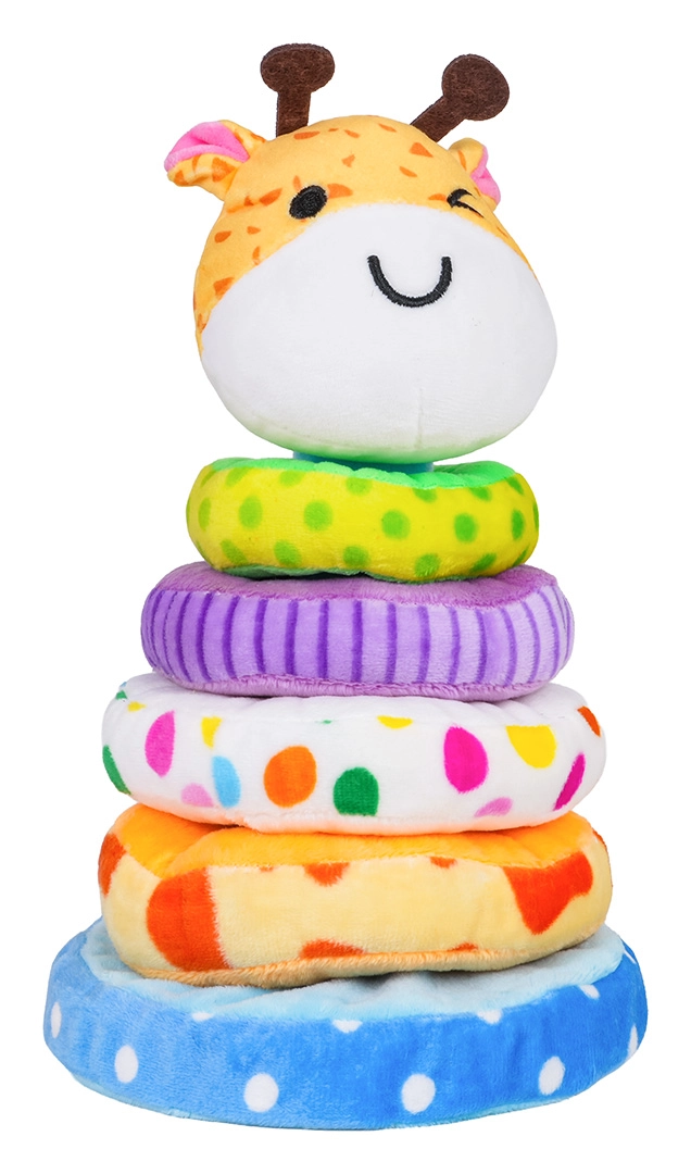 Roztomilá mäkká pyramída v tvare žirafy rozvíja jemnú motoriku, koordináciu oko–ruka a učenie triedenia podľa veľkosti. Farebné, mäkké krúžky z plyšu lákajú na dotyk a bezpečnú hru. V hlave žirafy je ukrytá píšťalka, ktorá pri stlačení vydá zvuk a podnecuje zmyslové vnímanie. Ideálna hračka pre deti od 18 mesiacov.