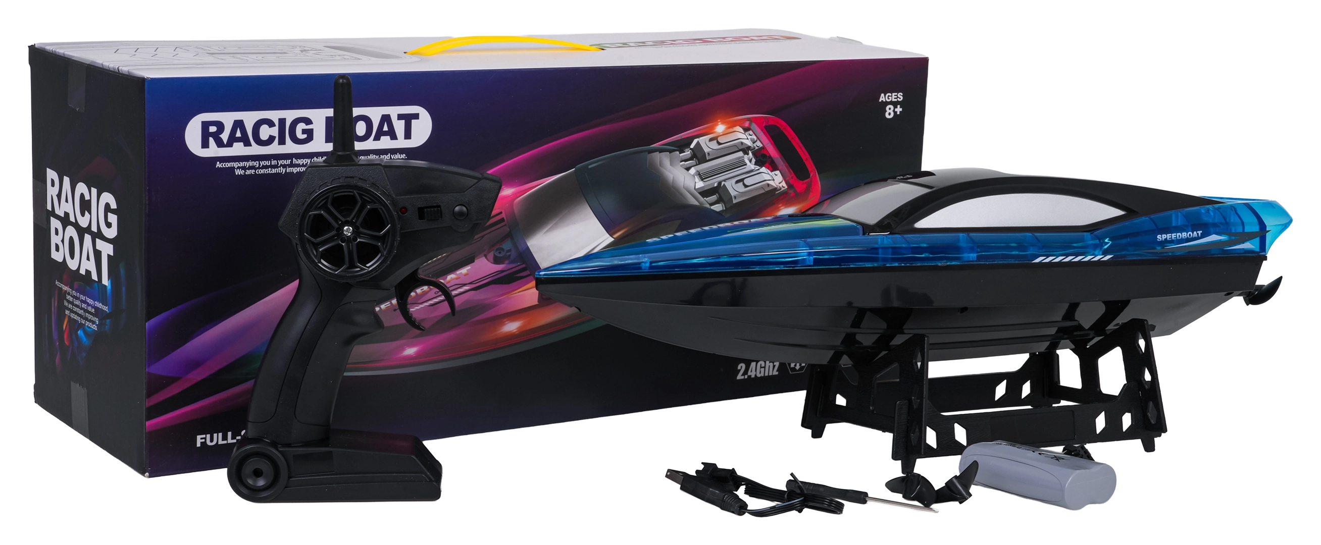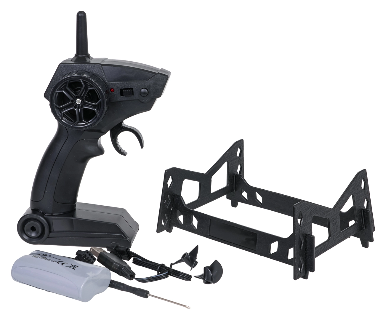- Čln, diaľkový ovládač 2,4 GHz, akumulátor, USB nabíjací kábel, 2× náhradná vrtuľka, skrutkovač, stojan na čln, návod