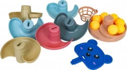 Loptičky plynulo schádzajú po viacerých poschodiach a deti sledujú ich pohyb od košíka až do zbernej základne. Skvelá vizuálno-motorická aktivita.