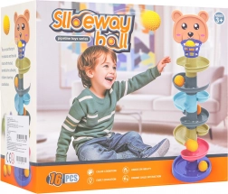 Set obsahuje 16 dielov vrátane stabilnej základne, 6 poschodí, hlavičky medvedíka s košíkom a 7 ľahkých, textúrovaných loptičiek príjemných do detskej ruky. Modulárny dizajn umožňuje dráhu ľubovoľne upravovať podľa veku aj zručností dieťaťa.