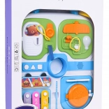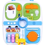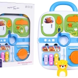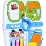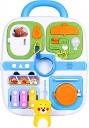Tento modrý manipulačný kufrík je ideálnou voľbou pre malých objaviteľov. Ponúka pestrú škálu aktivít, ktoré podnecujú detskú zvedavosť – od otváracích dvierok na kľúčik, cez vysúvacie prvky a otočné ovládače, až po svetelný efekt žiarovky po zapojení káblu. Stredový macko po stlačení zapíska a tri tlačidlá (koliesko, trojuholník, štvorec) prehrávajú melódie a zábavné zvuky.