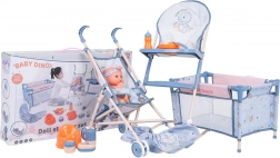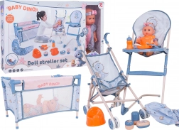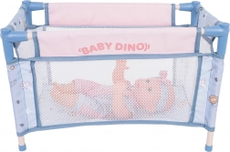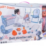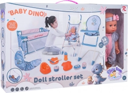 Táto mega sada BABY DINO prináša deťom množstvo možností na kreatívnu a realistickú hru na starostlivosť. Bábika má pohyblivé ruky a nohy, je oblečená do farebných dupačiek s čelenkou a môže piť z fľaštičky a robiť „cikanie“ do nočníka. Vďaka ľahkému kočíku, cestovnej postieľke a jedálenskej stoličke môžu deti bábiku kŕmiť, voziť aj uspávať.