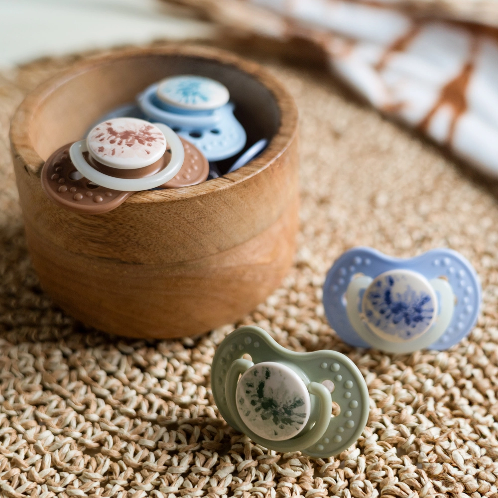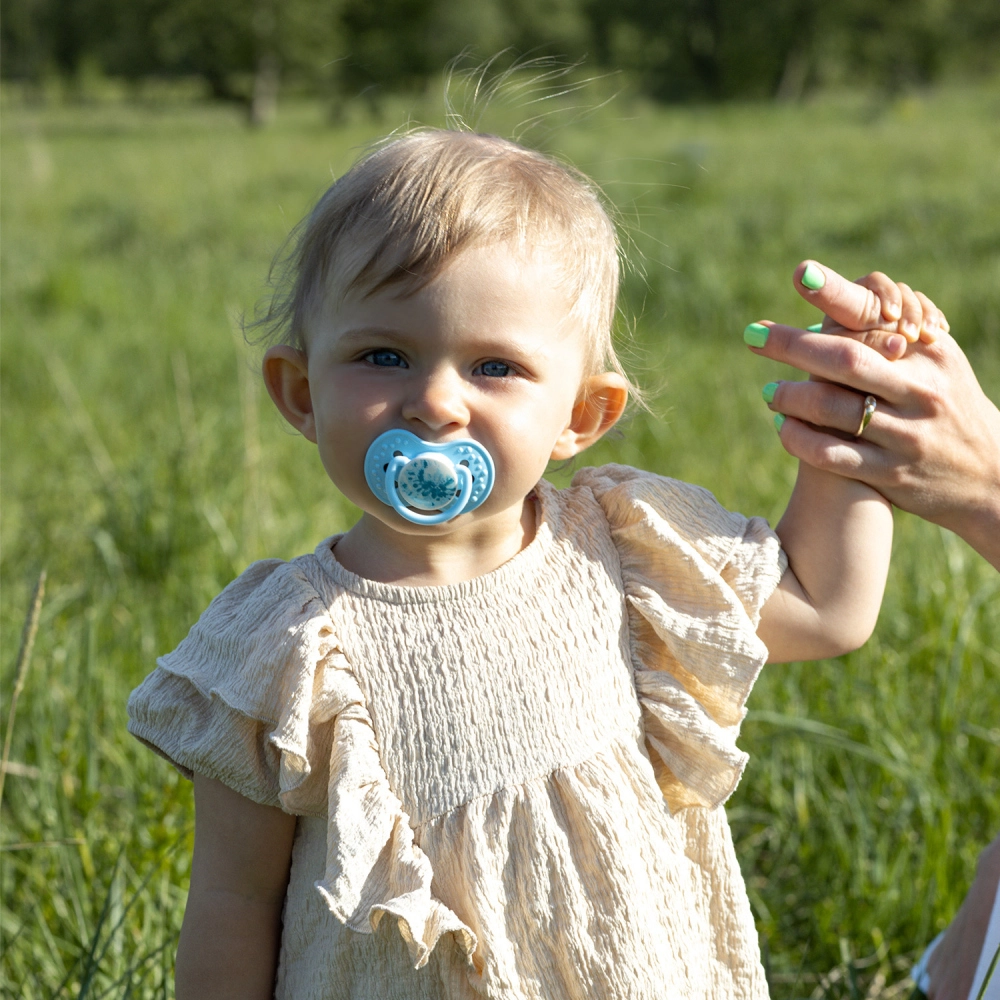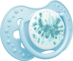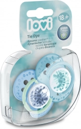 Dynamický cumlík LOVI Tie Dye 18m+ napodobňuje prirodzené sanie z prsníka. Homogénna silikónová vrstva sa pri saní sťahuje a rozpína, špička je symetrická a splštená pre správnu prácu jazyka a prirodzené zatváranie úst. Ľahký, ergonomický štítok s ventilačnými otvormi pomáha predchádzať podráždeniu pokožky a tvar pod nosom uľahčuje voľné dýchanie.