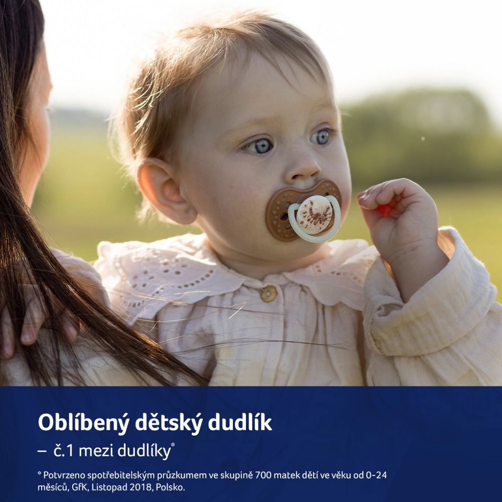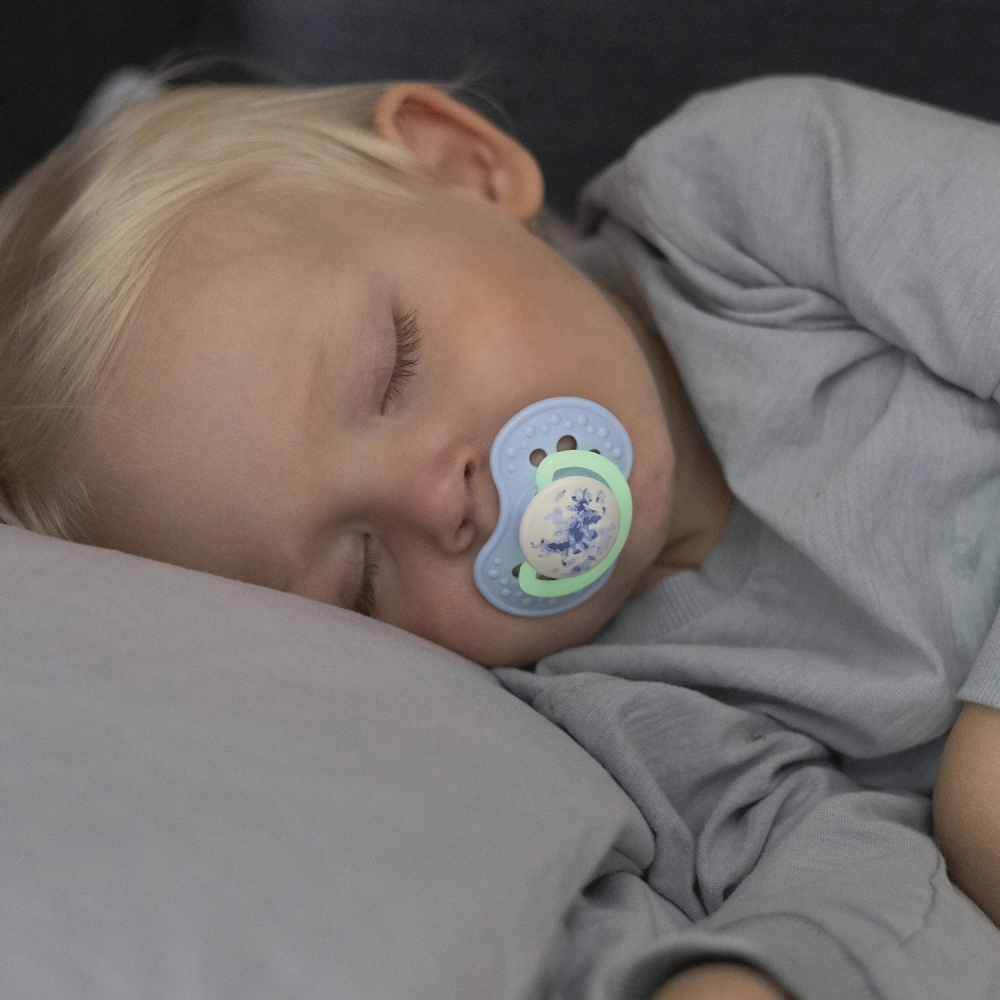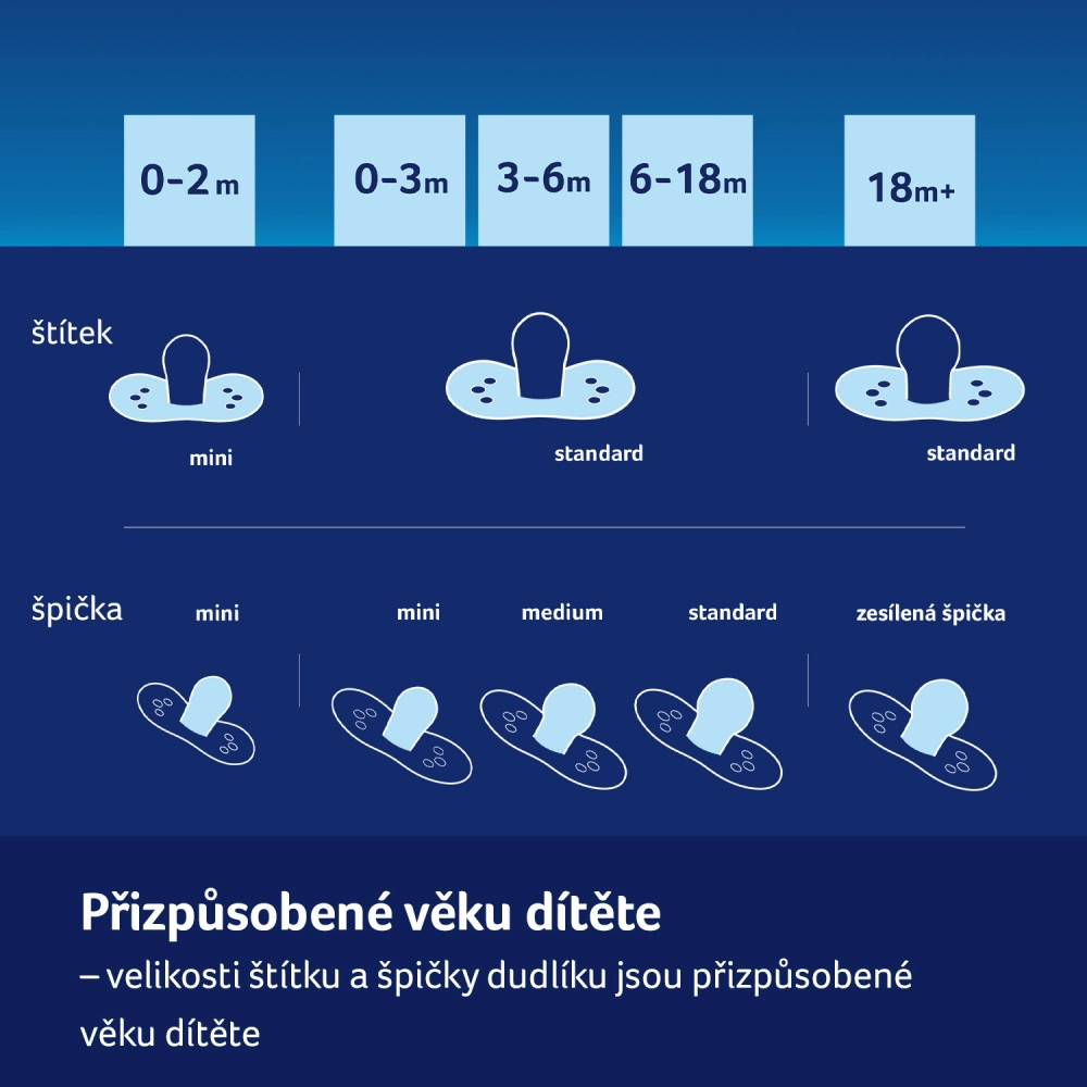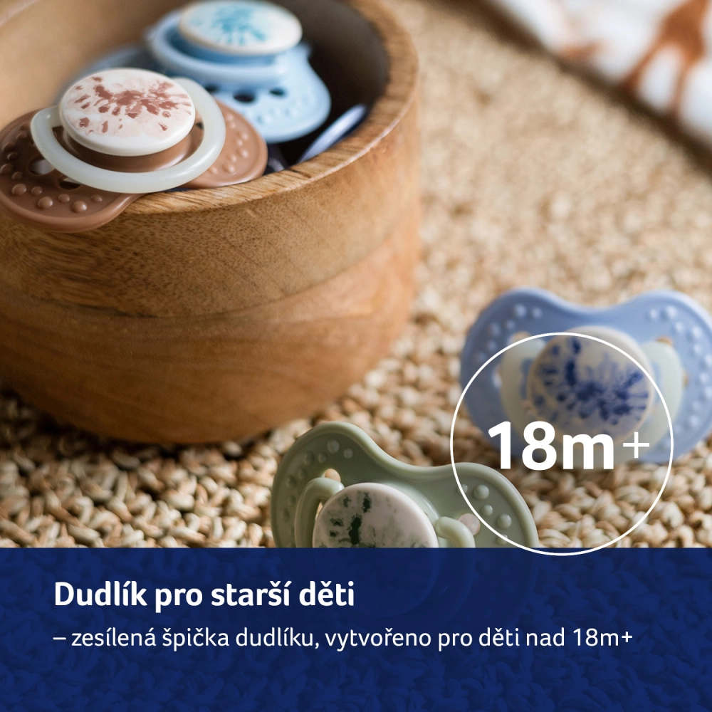 Pre staršie deti (18m+) je cumlík vybavený zosilnenou silikónovou špičkou odolnejšou proti hryzeniu. Svietiace držadlo zaistí rýchle nájdenie v noci. Materiály sú BPA free, bez chuti a zápachu, vhodné pre citlivé bábätká. Súčasťou je praktické puzdro na hygienické uchovávanie.