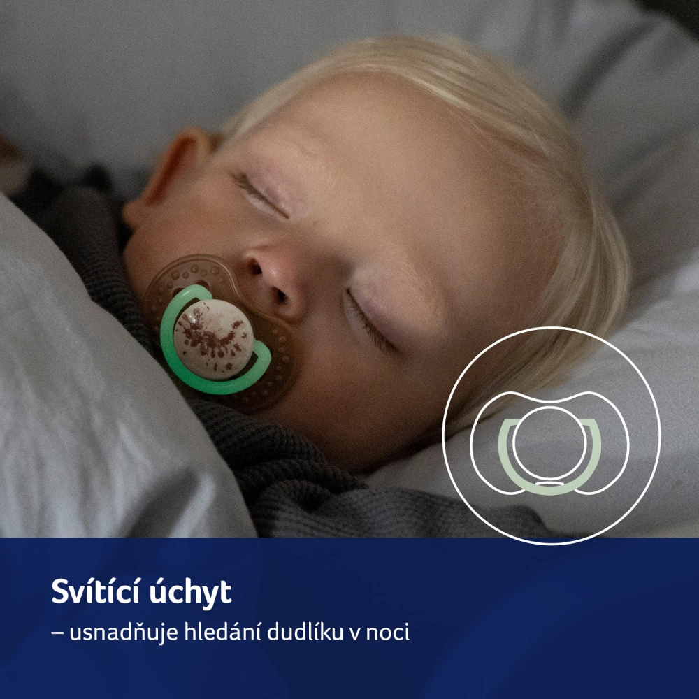 Ergonomický štítok s ventilačnými otvormi je šetrný k pokožke. Svietiace držadlo uľahčí rýchle nájdenie cumlíka počas noci.