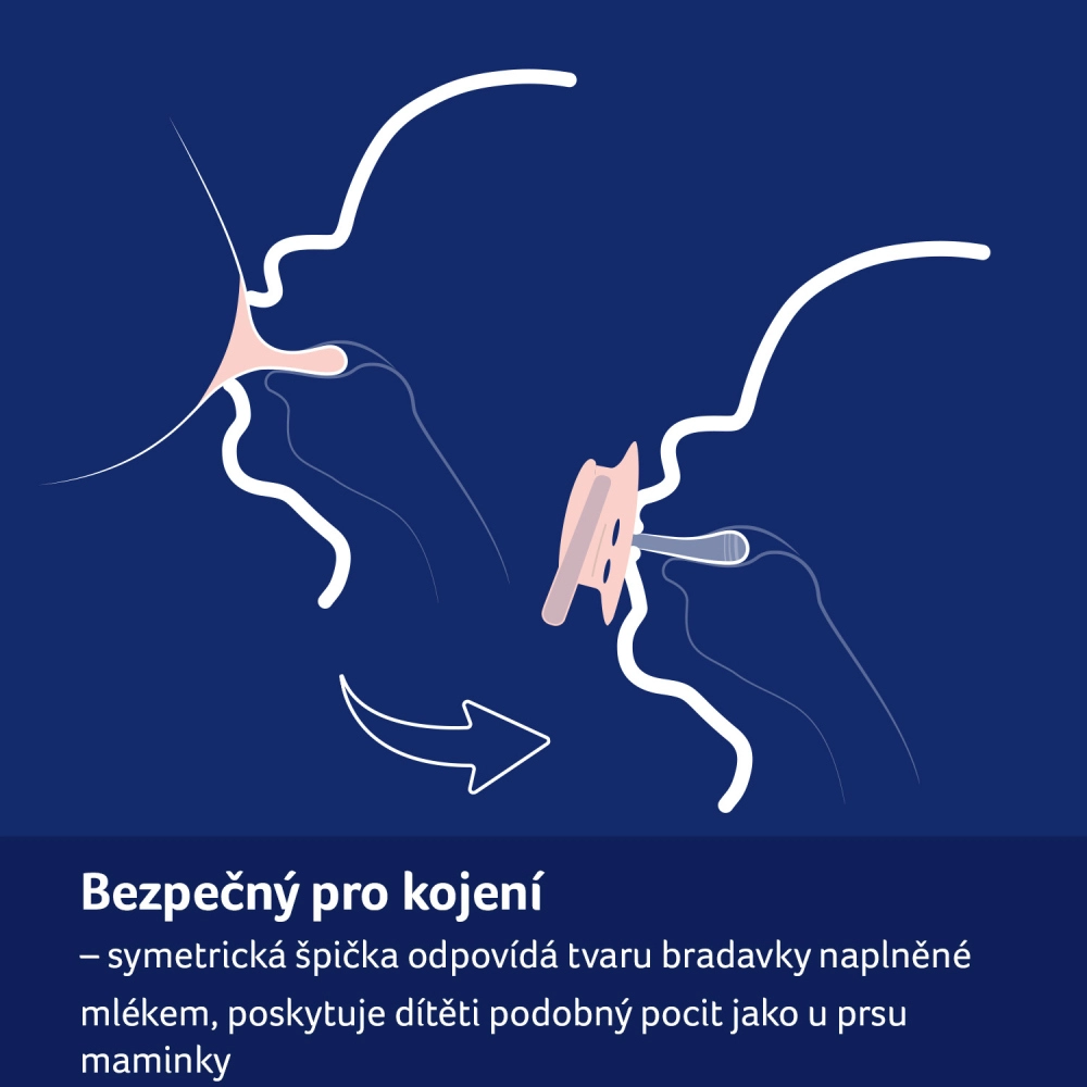 Homogénny silikón sa pri saní rytmicky sťahuje a rozpína. Splštený, symetrický tvar podporuje správnu prácu jazyka a voľné zatváranie úst.