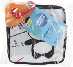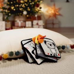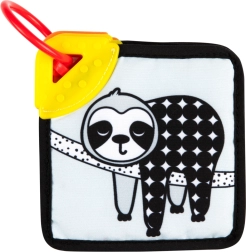 Súčasťou je flexibilné hryzátko v rohu každej karty na masáž ďasien a úľavu pri prerezávaní. Plastový krúžok umožní jednoduché pripnutie na postieľku, kočík, hojdačku alebo autosedačku – ideálne doma aj na cesty.