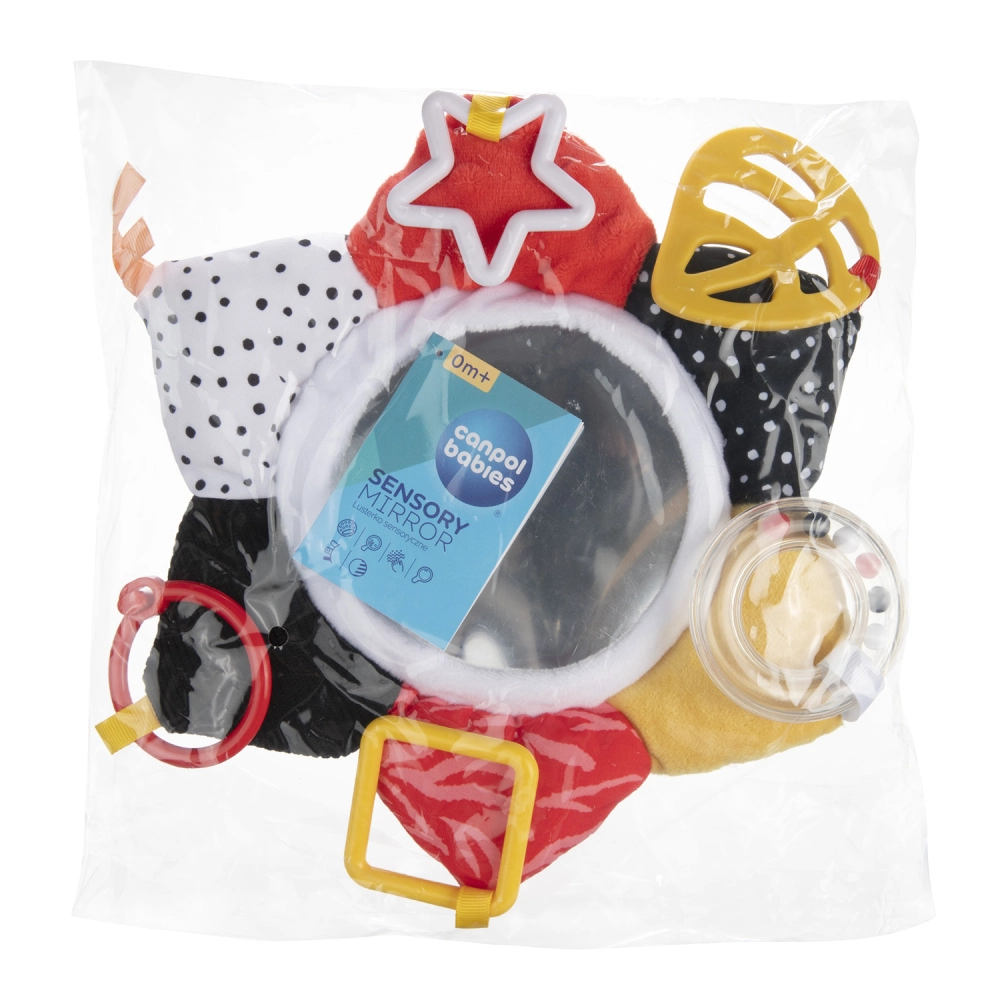 Zábavná a rozvojová hračka pre najmenších: mäkké senzomotorické zrkadielko CANPOL babies z kolekcie BabiesBoo s kontrastnými farbami, bezpečným zrkadielkom, šuštiacimi prvkami, hryzátkom a hrkálkou. Vďaka praktickému krúžku ju ľahko pripnete na kočík, postieľku alebo autosedačku a podporíte rozvoj zraku, sluchu, hmatu aj jemnej motoriky od 0m+.