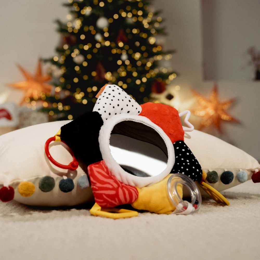 Senzorické zrkadielko BabiesBoo je navrhnuté pre prirodzené objavovanie sveta od prvých dní života. Kontrastné vzory, rozmanité textúry a jemné zvukové podnety motivujú bábätko k uchopovaniu, stláčaniu, prezeraniu aj počúvaniu. Mäkké materiály sú príjemné na dotyk a bezpečné na každodenné hranie doma aj na cestách.