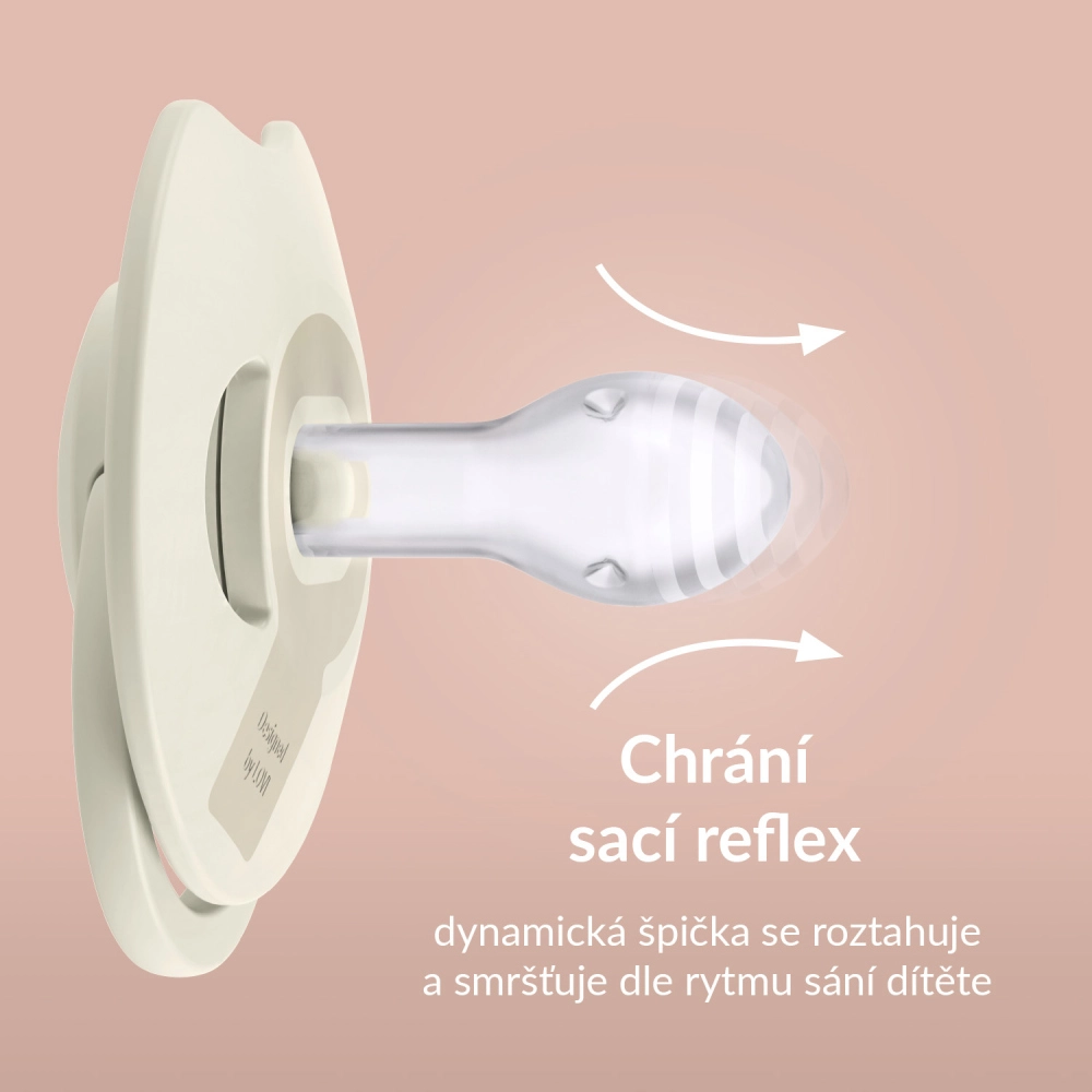 Silikónová savička rôznej hrúbky sa pri saní prirodzene rozťahuje a sťahuje. Dieťa tak saje vlastným tempom a cumlík podporuje dojčenie aj prirodzené návyky.