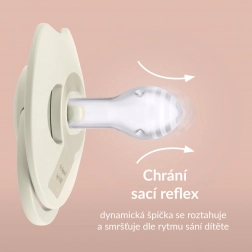Ľahký a ergonomický profilovaný štítok s vetracími otvormi minimalizuje kontakt s pokožkou a umožňuje voľné prúdenie vzduchu, čím znižuje riziko podráždenia. Odolný silikón drží tvar v ústach, tenký krčok a sploštená savička podporujú správnu prácu ďasien a jazyka a znižujú riziko maloklúzie. Štýlový, harmonický dizajn skvelo ladí s detskou výbavou.