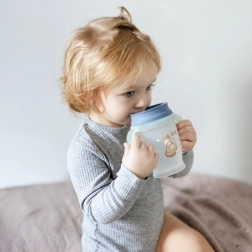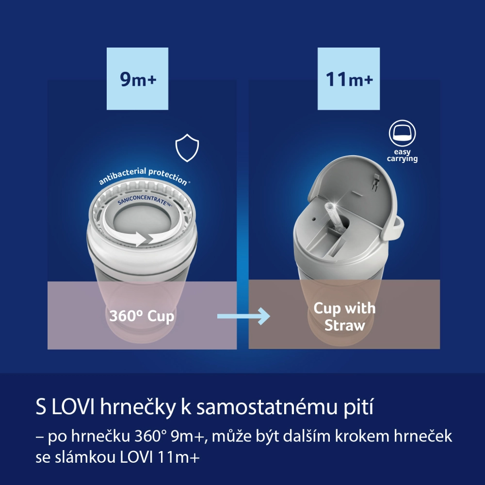 Hrnček Lovi 360° Night & Day je skvelým krokom od fľaše k bežnému hrnčeku. Dieťa pije prirodzeným spôsobom ako z pohára, ale bez zbytočného rozlievania. Mäkká, utesnená hrana umožňuje nasávať tekutinu odkiaľkoľvek po obvode, čím podporuje správne návyky pitia.