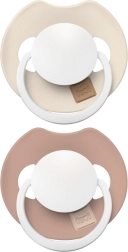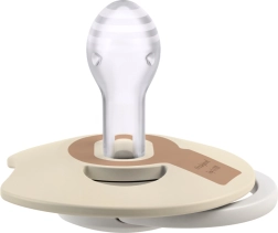 Ergonomicky tvarovaný štítok s výrezom uvoľňuje oblasť nosa, podporuje voľné dýchanie a vďaka vetracím otvorom znižuje riziko podráždenia pokožky. Cumlík je veľmi ľahký, nezaťažuje zhryz a nedeformuje sa v ústach vďaka kvalitnému silikónu. Svietiace prvky uľahčia nočné hľadanie a elegantné, nadčasové farby Ivory/Blush skvele ladia s výbavičkou.