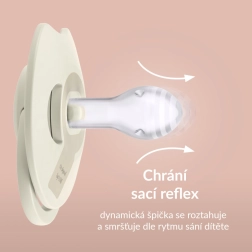 Satôček sa prirodzene rozťahuje a sťahuje podľa rytmu sania, podporuje dojčenie a prirodzený vývoj reči a zhryzu*.
