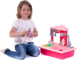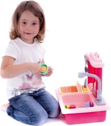 Ružový detský drez na riad s batériovým kohútikom a doplnkami