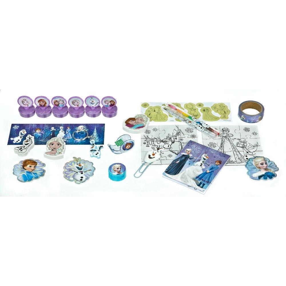 Vo vnútri nájdete pestrú zmes doplnkov a školských potrieb – od mini pečiatok a nálepiek až po zápisníček či tvarované gumy. Všetko zladené do zimného sveta FROZEN, aby bol každý deň adventu naozaj magický.