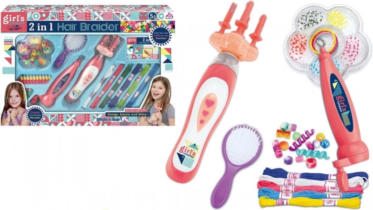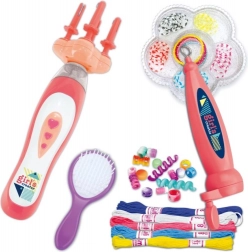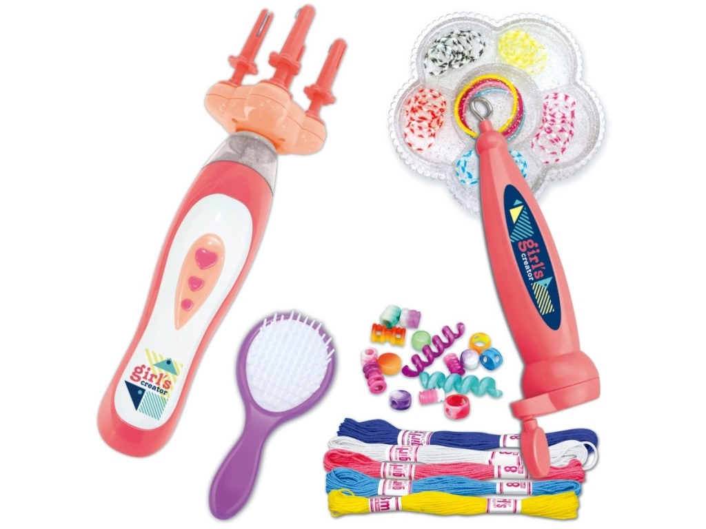 V balení nájdete všetko na okamžité tvorenie: navliekač na rýchlu prácu, rôzne koráliky na pestré kombinácie, hrebeň na úpravu, bavlnky a gumičky na fixáciu a zapletač na batérie 2× AA. Sada je vhodná pre deti od 3 rokov.