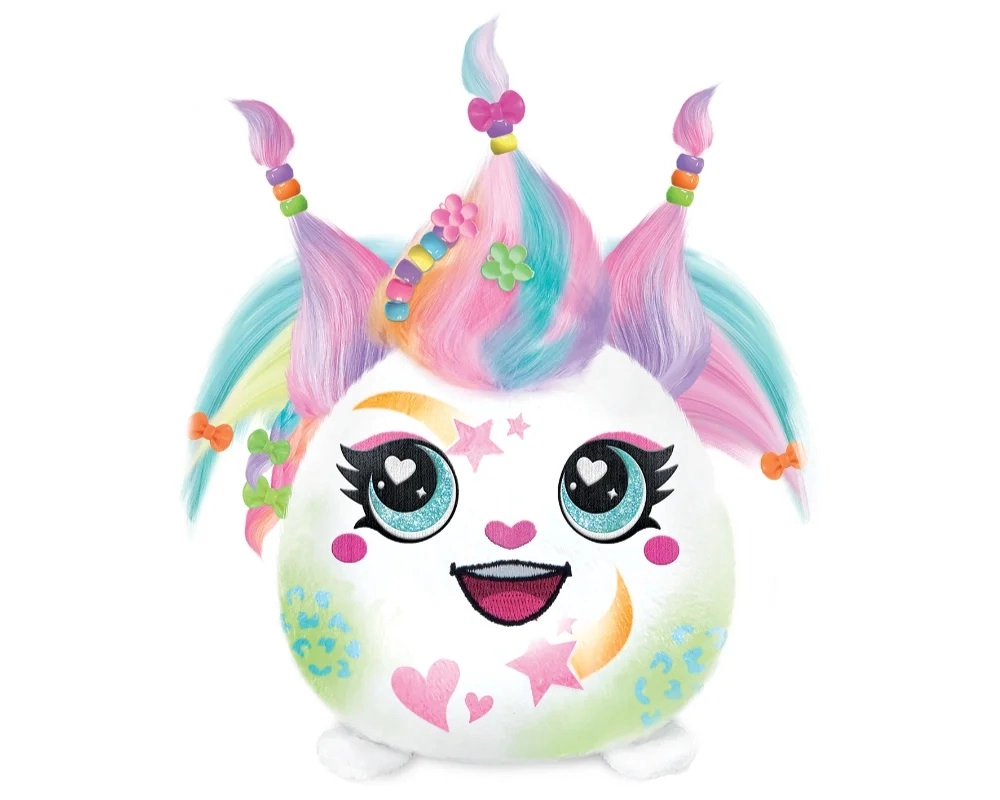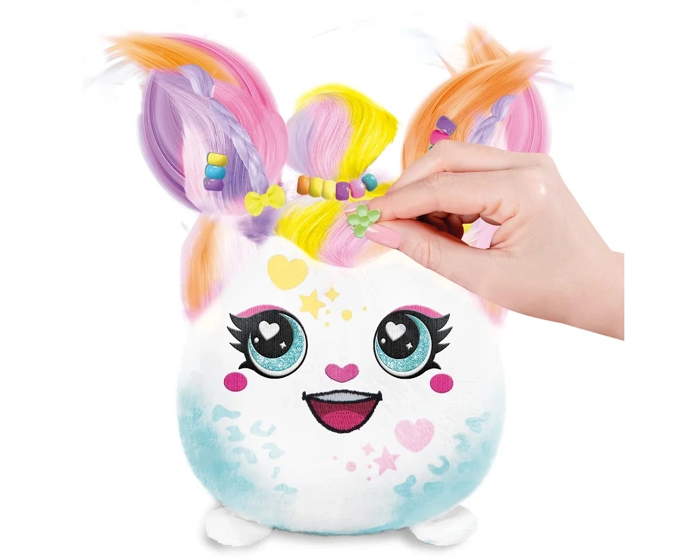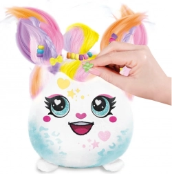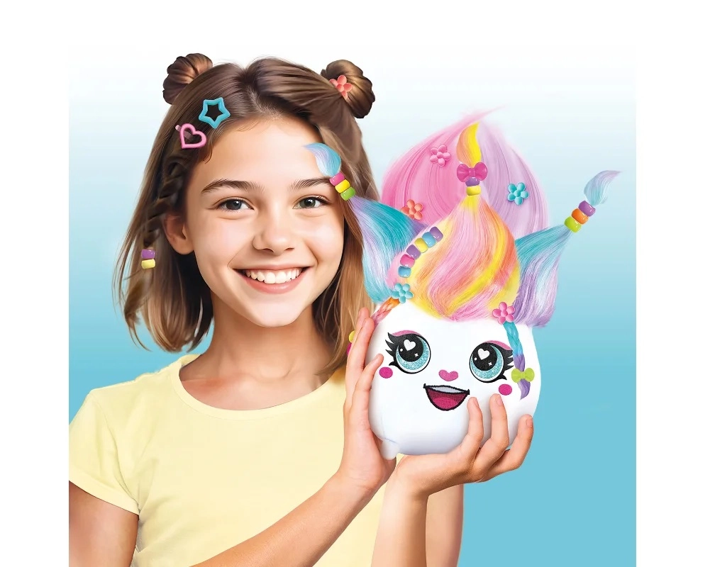 Sponky, gumičky, koráliky a hrebeň podporia tvorbu vrkočov, vĺn a ozdobných detailov. Styling je zábavný, mäkký plyš láka na mojkanie.